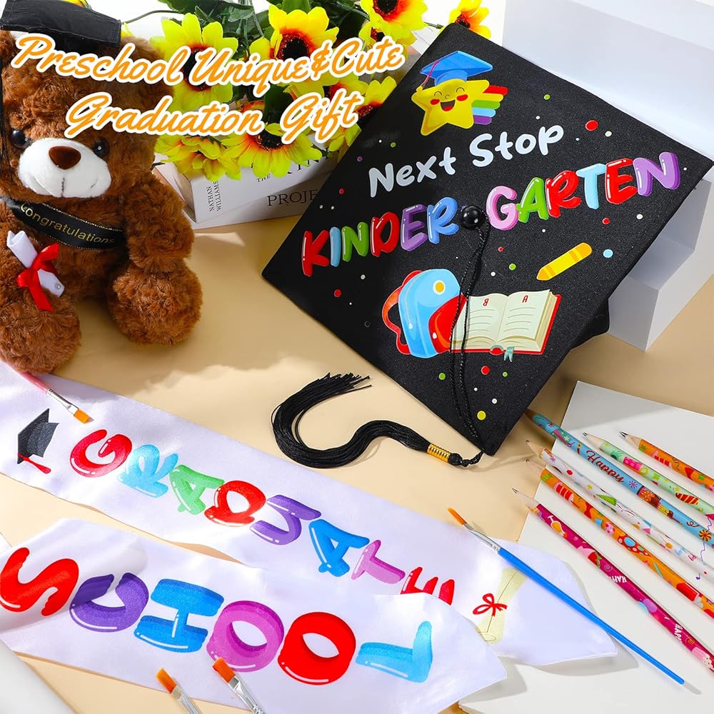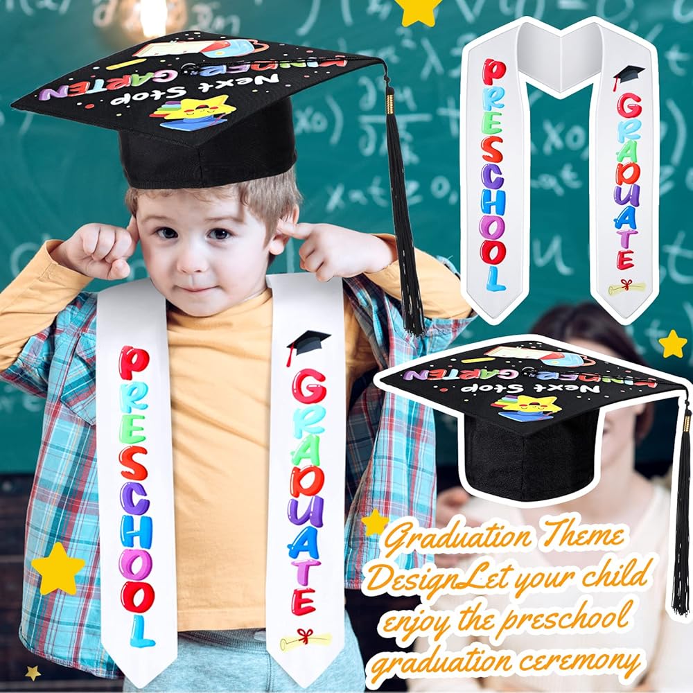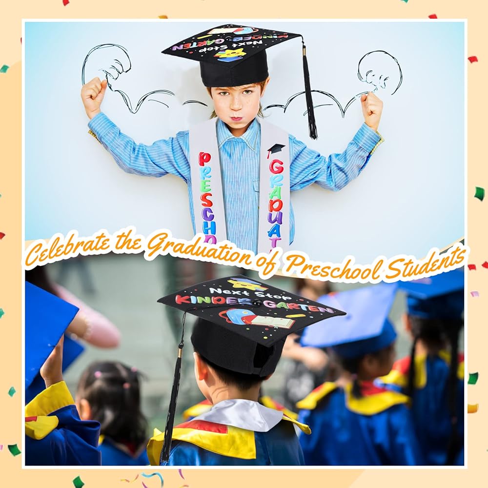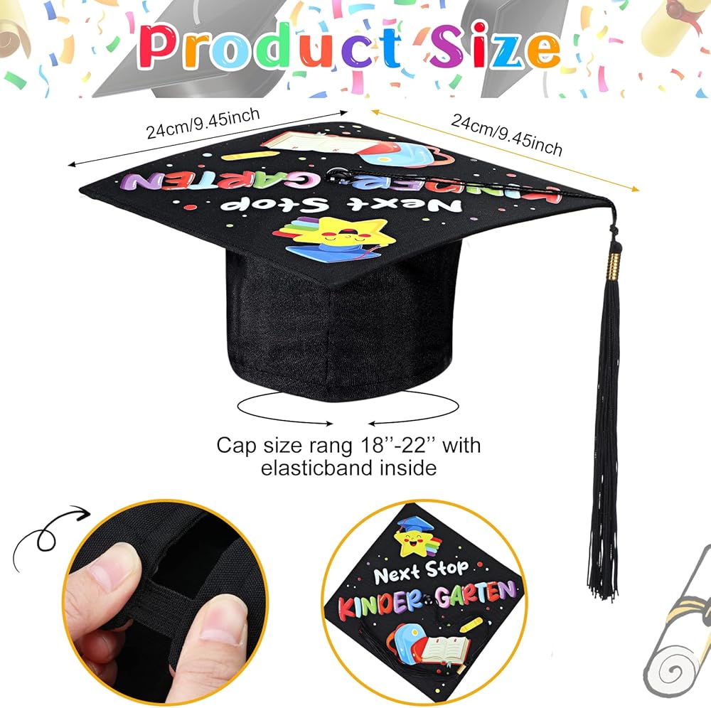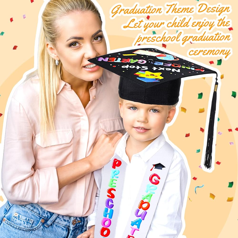منتج التخرج في العبوة: ما ستحصل عليه هو قطعة واحدة من قبعة التخرج وقطعة واحدة من وشاح التخرج؛ تمت طباعة الغطاء بكلمات ملهمة [Next Stop KINDERGARTEN] وعناصر أخرى