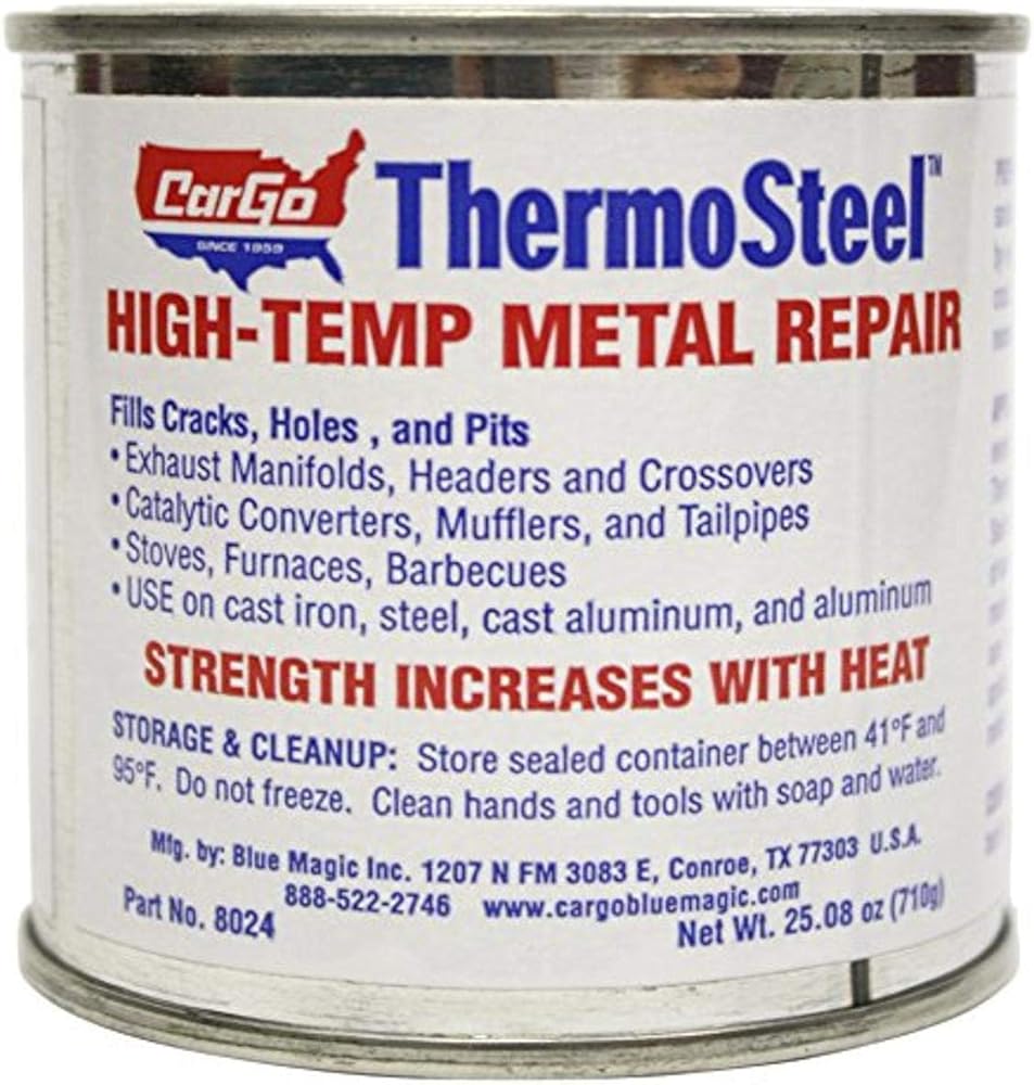 CarGo ThermoSteel high temp repair kit fills cracks and pits. Will withstand direct flame and strength increases with heat. Repairs furnaces, BBQ's or any high heat item. Professional size 25.08 ounce.