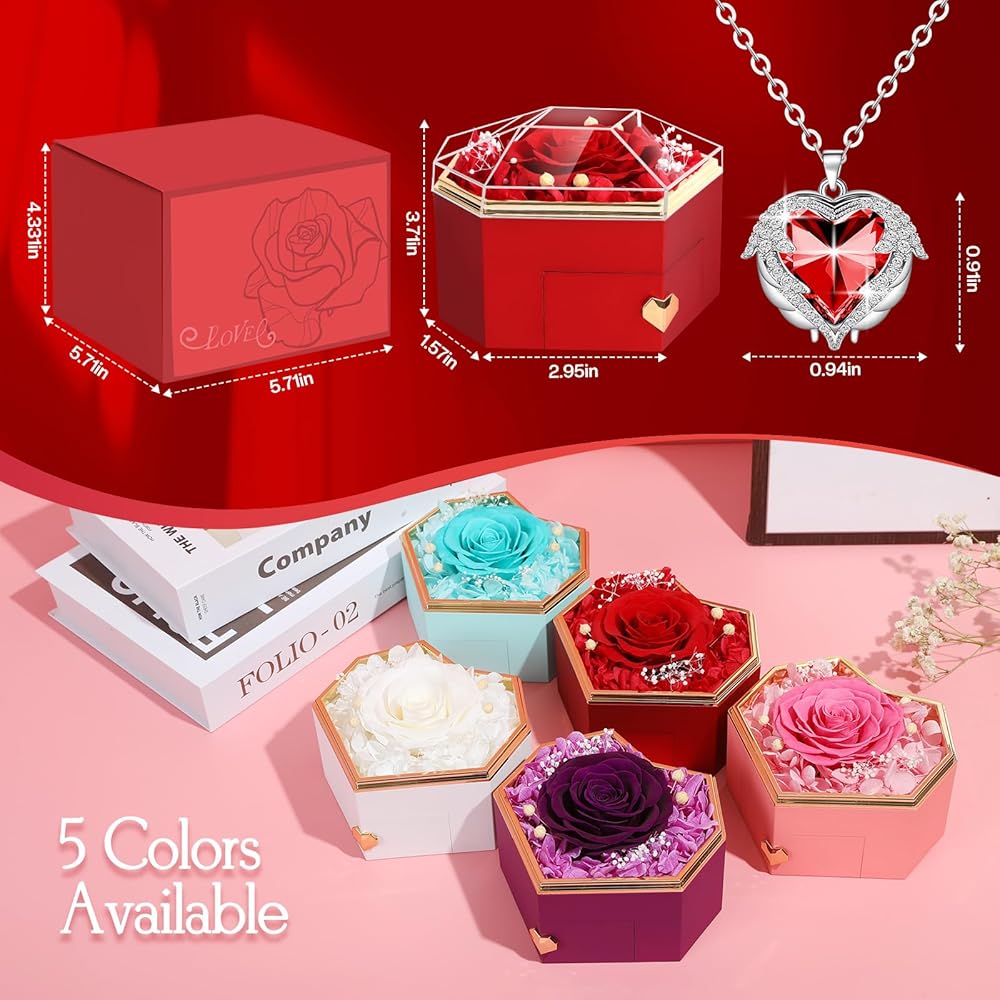 وردة حمراء حقيقية محفوظة مع قلادة زهور للأبد صندوق على شكل ألماس للأم والزوجة والصديقة والجدة في عيد الأم وعيد الحب وعيد الحب والذكرى السنوية للكريسماس هدايا جميلة للنساء...