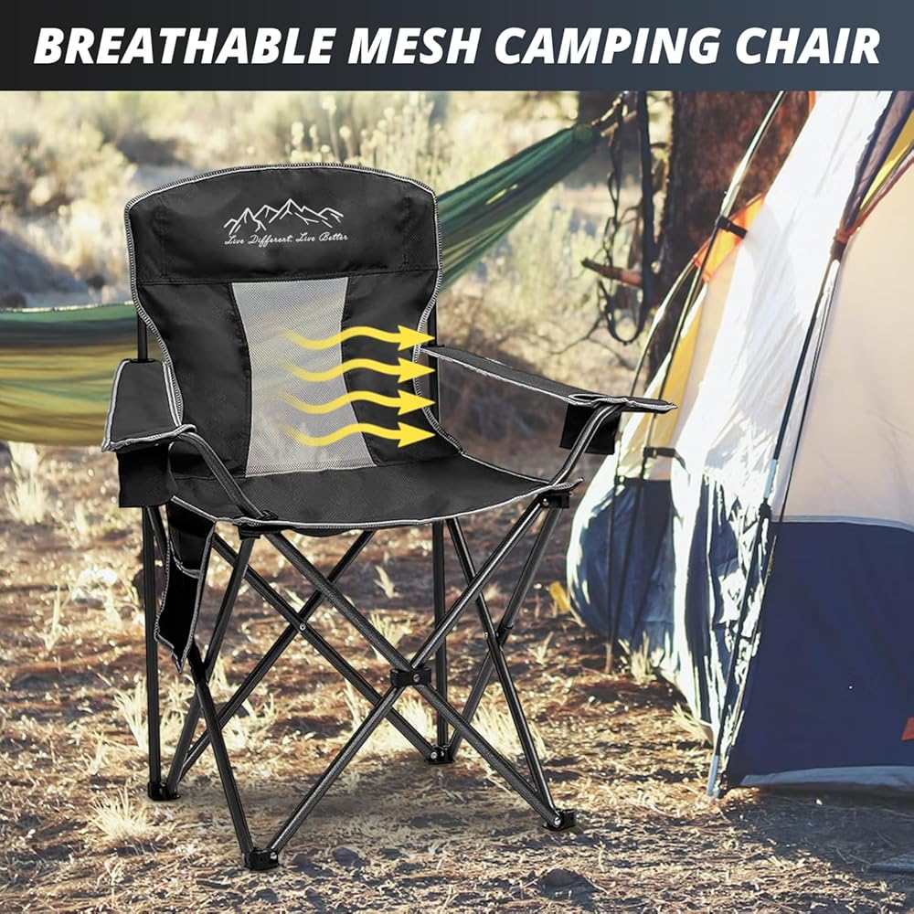 كرسي تخييم مريح: يتميز كرسي التخييم كبير الحجم بتصميم شبكي، مما يوفر أقصى قدر من الراحة أثناء الجلوس. مقاوم للتمزق، ومسامي، ومقاوم للماء، وسهل التنظيف، ومناسب للاستخدام الخارجي طويل الأمد.