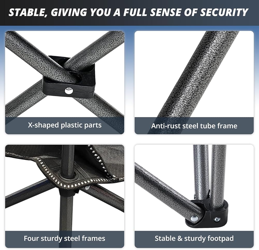 متين ومتين: يتميز كرسي التخييم بأنابيب فولاذية سميكة وقوية، وتعزيز مبتكر على شكل X، وأربعة إطارات فولاذية شديدة التحمل، مما يوفر الثبات وقدرة تحمل تصل إلى 325 رطلاً.