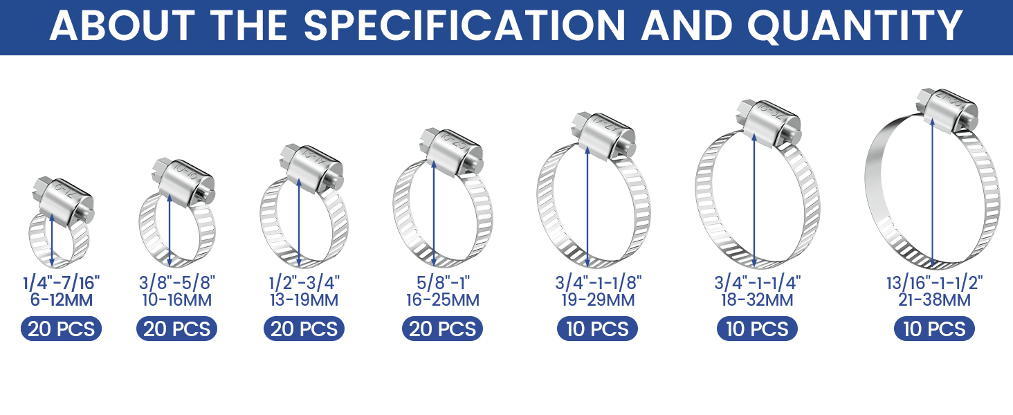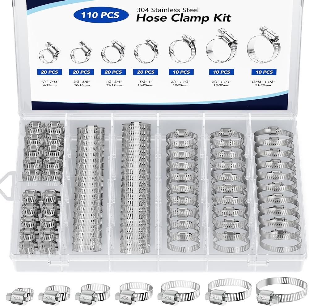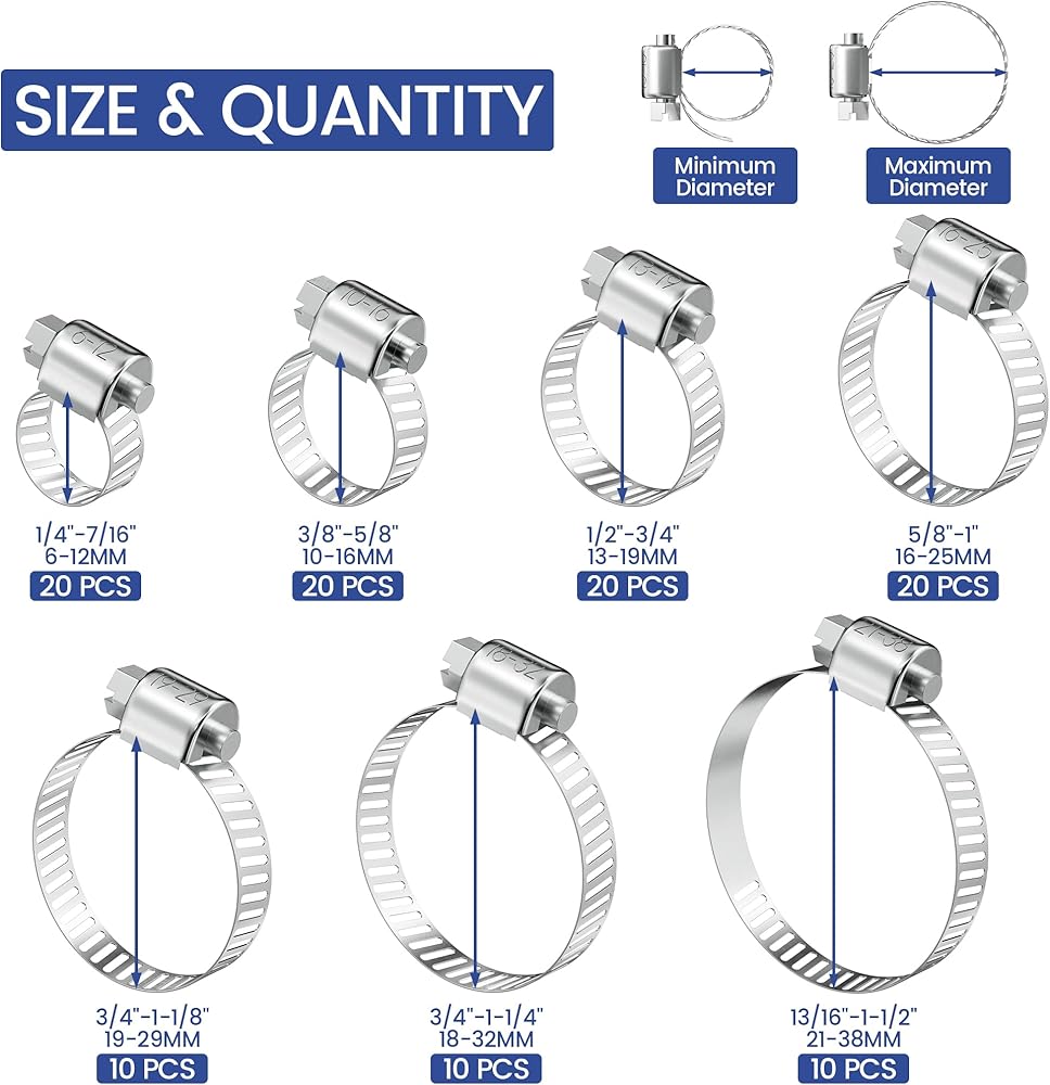 حجم قابل للتعديل: مجموعة متنوعة من مشبك خرطوم 110 قطعة. نطاق الحجم من 1/4 بوصة إلى 1-1/2 بوصة (6 مم إلى 38 مم). 7 أحجام مختلفة بما في ذلك 1/4 بوصة إلى 7/16 بوصة (20 قطعة)، 3/8 بوصة إلى 5/8 بوصة (20 قطعة)، 1/2 بوصة إلى 3/4 بوصة (20 قطعة)، 5/ 8 بوصة إلى 1 بوصة (20 قطعة)، 3/4 بوصة إلى 1-1/8 بوصة (10 قطع)، 3/4 بوصة إلى 1-1/4 بوصة (10 قطع)، 13/16 بوصة إلى 1-1/2 بوصة (10 قطع)