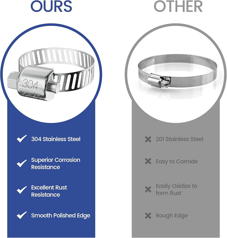 مواد عالية الجودة: مشابك الخرطوم الخاصة بنا مصنوعة من الفولاذ المقاوم للصدأ 304 عالي الجودة، بما في ذلك الإبزيم والمسامير والشريط. مقاوم للتآكل، ومضاد للصدأ، ومقاوم للملح، ومقاوم للماء والزيت. لم تعد تقلق بشأن الصدأ والكسر عند استخدامها في الداخل أو الخارج.
