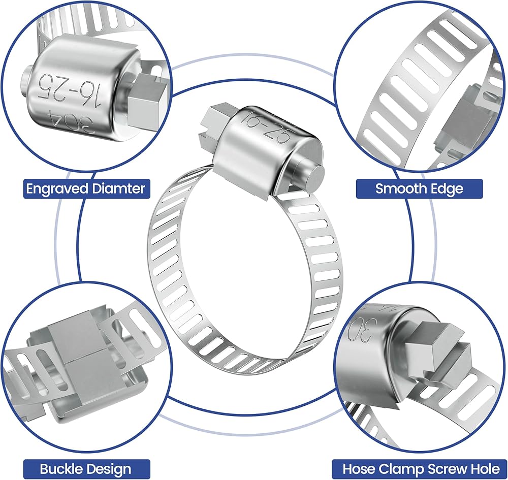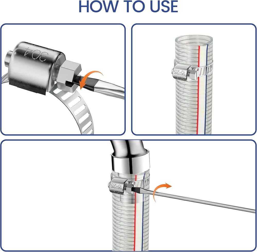 سهلة التركيب: يتم وضع علامة على قطر مشابك الخرطوم على سطح الشريط لسهولة التعرف عليها. كل ما عليك هو استخدام مفتاح ربط أو مفك براغي لفك المسمار، ثم قم بتمرير الأنبوب من خلال مشبك الأنبوب وضبط الحجم ليناسب حجم خرطومك وشد المسمار.