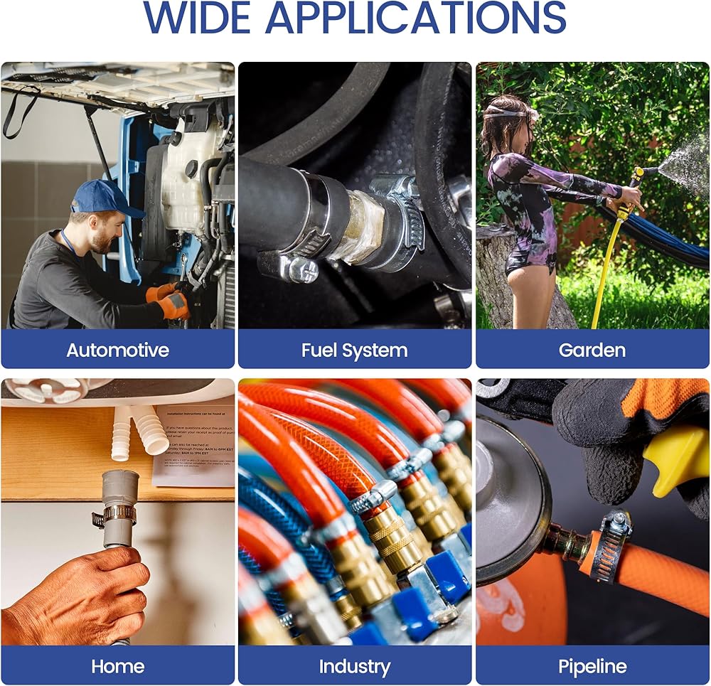 تطبيقات واسعة: تُستخدم مشابك الخرطوم شديدة التحمل في تأمين وإغلاق الخراطيم والأنابيب والسباكة والكابلات والأنابيب وخطوط الوقود وما إلى ذلك. مثالية للاستخدام في المنزل، وخط الغاز، والري بالتنقيط، ورشاشات الحديقة، وحمام السباحة، والرادياتير، وخرطوم السخان، إصلاح الشاحنات، السيارات، الصناعية، القوارب، البحرية، الآسن، الميكانيكية، الإلكترونية الخ.