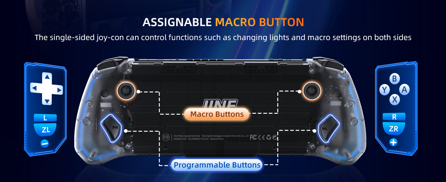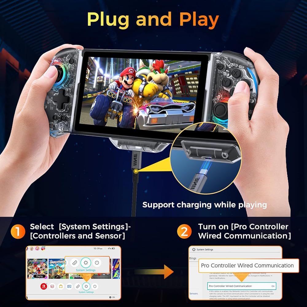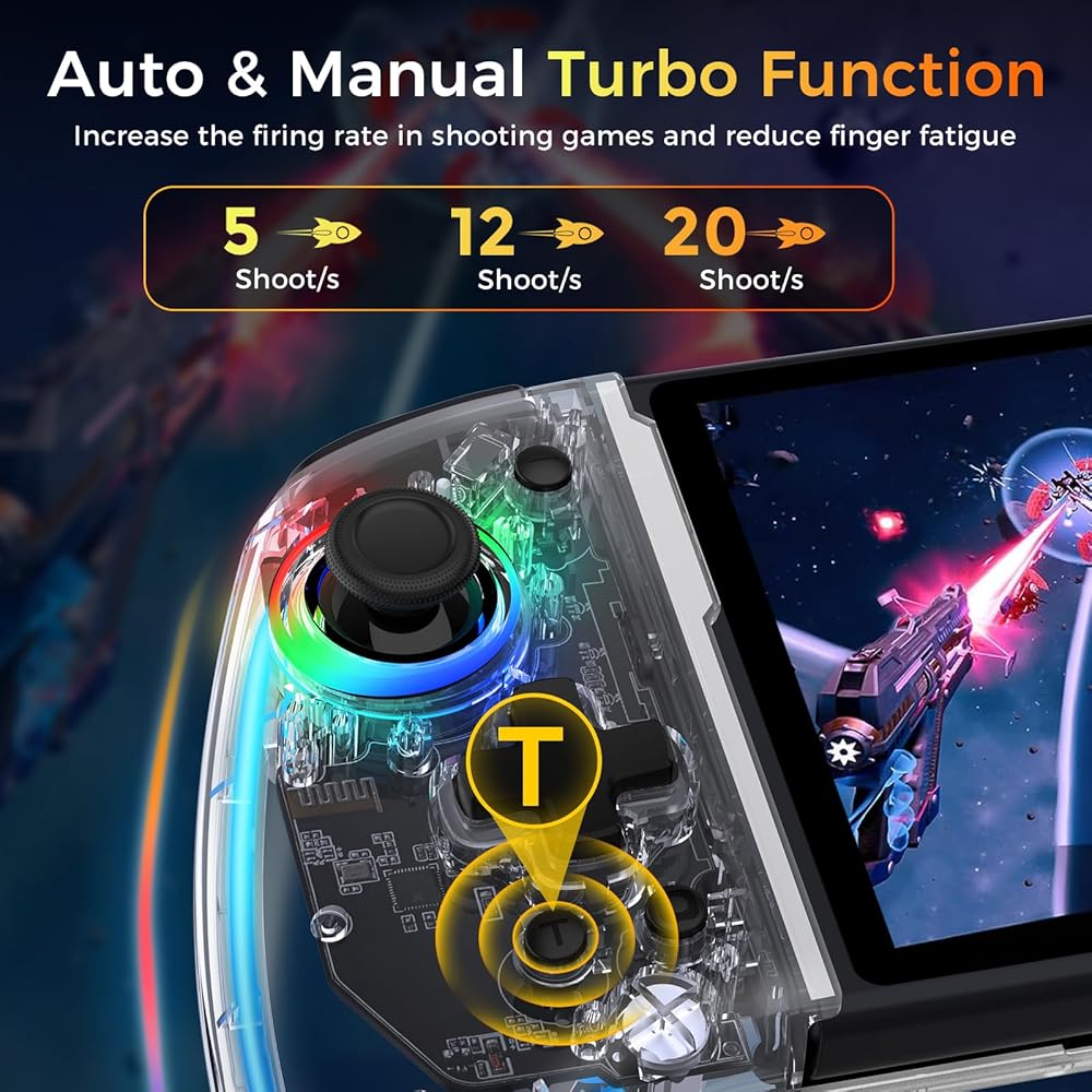 【إضاءة RGB ملونة وشفافة للغاية】 استمتع بتصميم Joy-Con الرائع والشفاف مع 8 ألوان RGB و3 أوضاع إضاءة وسطوع قابل للتعديل. يمكنك التحكم بسهولة في الأضواء الثنائية بضغطة زر.
