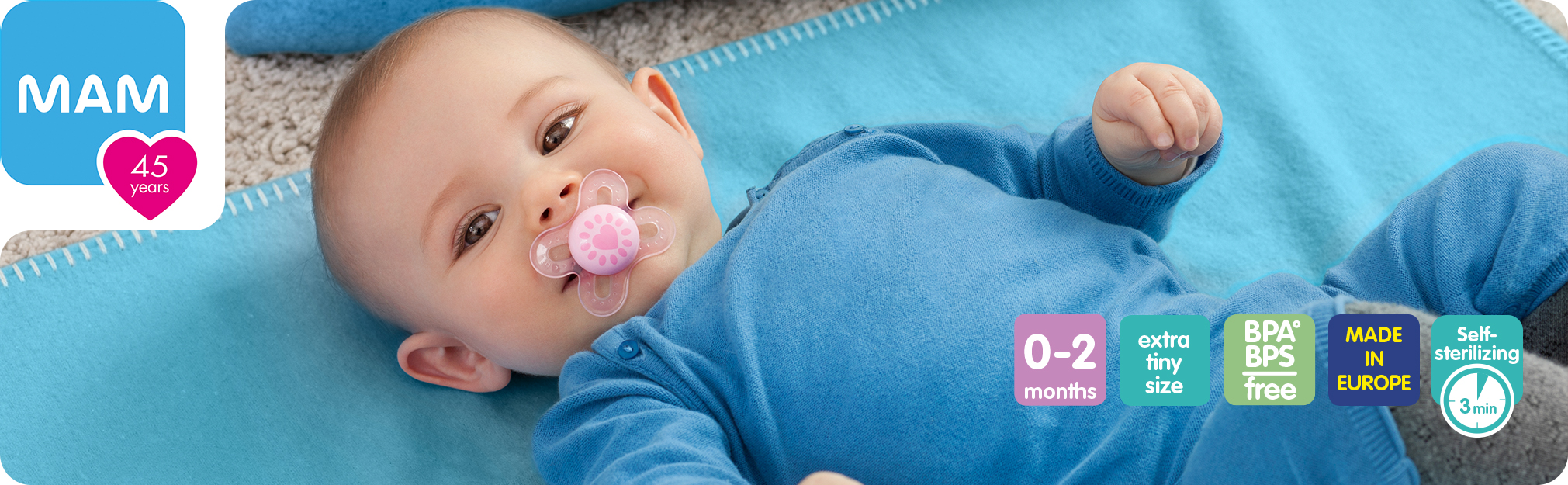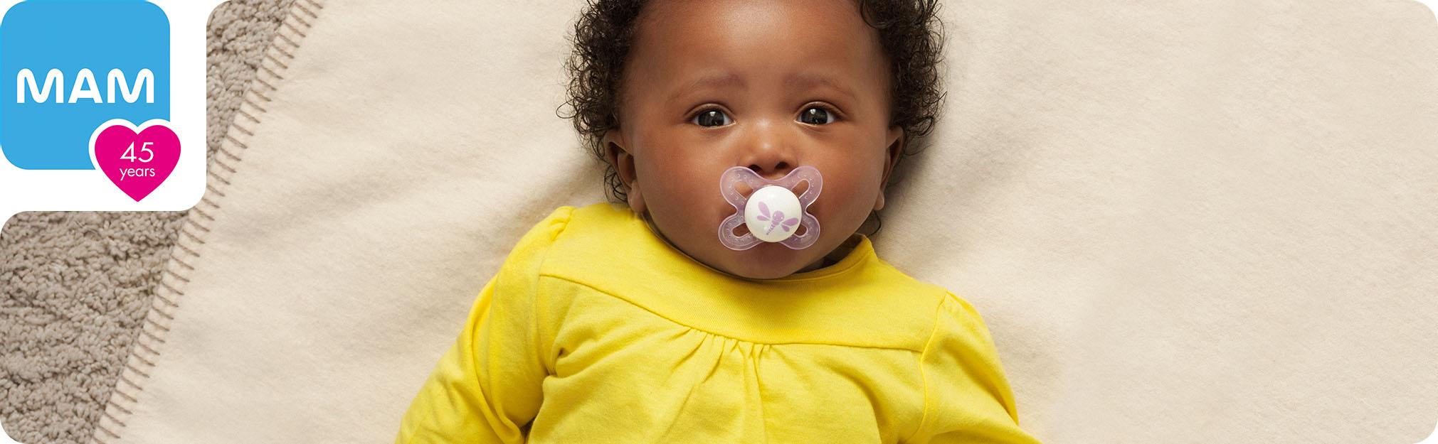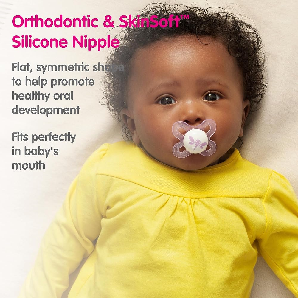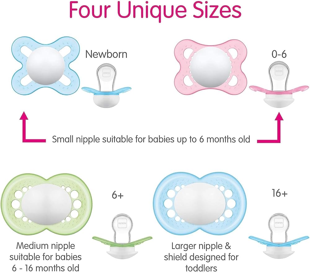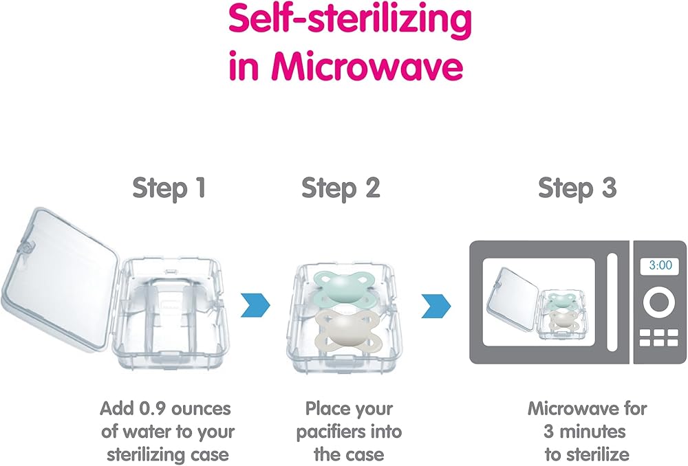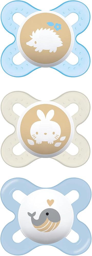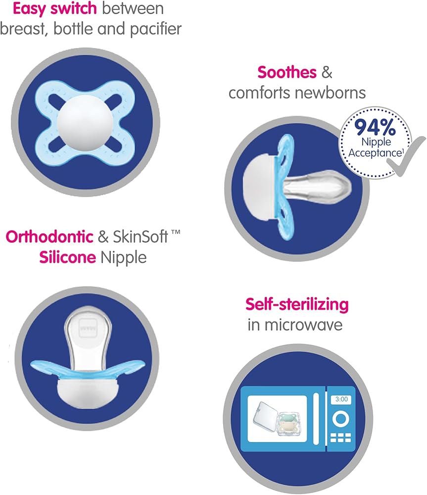 Our Value Pack contains 3 MAM orthodontic pacifiers that features an innovative breastfeed pacifier nipple designed to promote healthy oral development so you can soothe your baby with confidence, as well as a symmetrical nipple that fits perfectly in your baby's mouth at all angles. With the help of a built-in air channel, our pacifiers for baby naturally flattens and extends when sucked, mimicking a human nipple during breastfeeding. MAM's medically silicone pacifiers feature life-like, SkinSoft textured silicone that feels more natural, just like mom. With multiple pacifier shapes and shield sizes to pick from, MAM nipples are easily accepted by babies of all ages, with 94% nipple acceptance among babies tested*. Babies simply love the ease and comfort of latching onto MAM nipples. Sterilize baby's MAM pacifier in the microwave using the convenient MAM self- sterilizing case. Pacifiers kept in the closed box will remain clean for up to 48 hours: Fill pacifier case with water. Place pacifier in the pacifier case with the nipple facing down. Follow pacifier package instructions for microwave setting. Cool completely before use. *Market research 2010-2020, tested with 1,572 babies