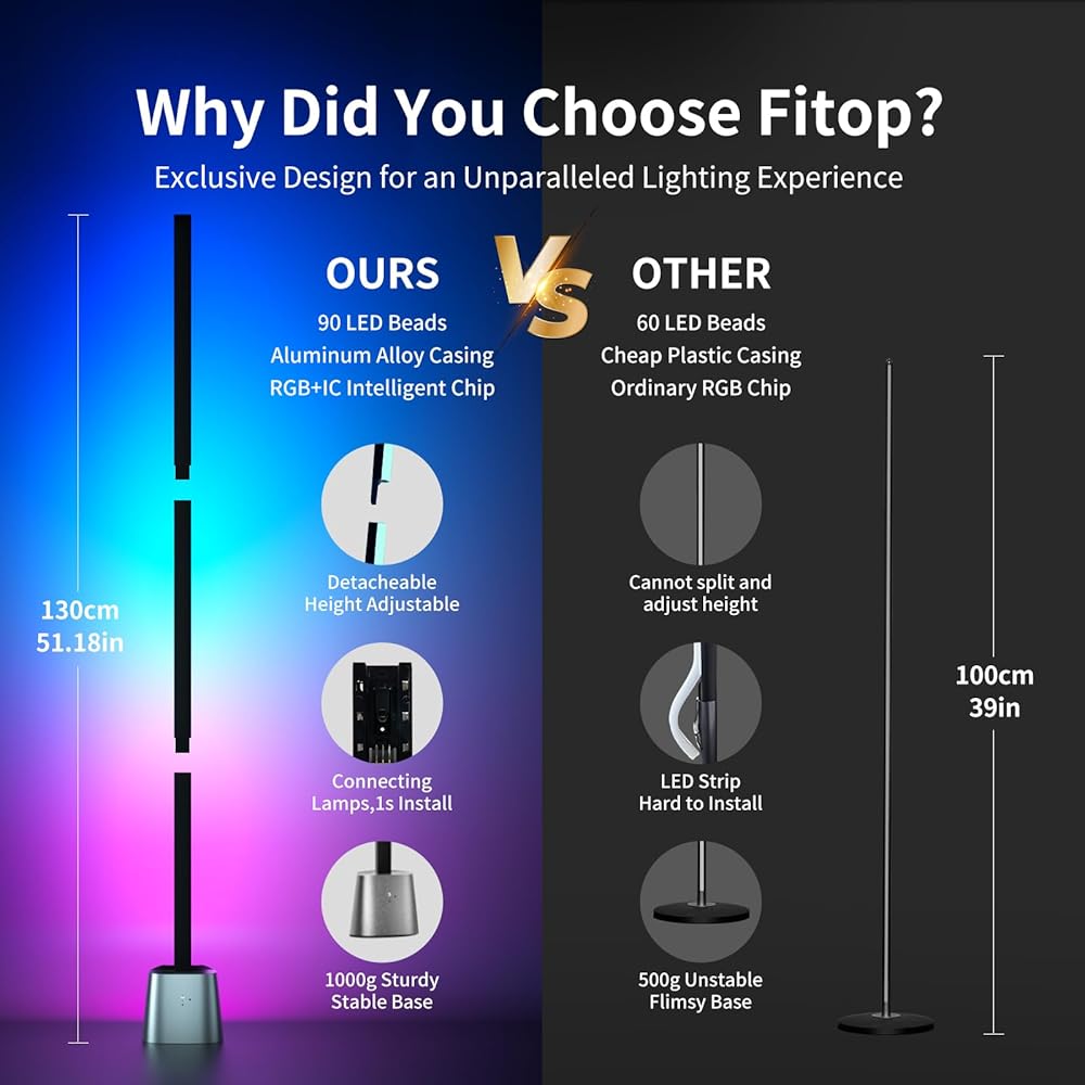 【سهل التجميع】تم تصميم هذا المصباح الأرضي ليكون سهل التجميع في ثلاث خطوات سهلة فقط. وهذا المصباح الأرضي الركني قابل للتعديل في الارتفاع ويمكن تطبيق التصميم القابل للفصل على مشاهد مختلفة.