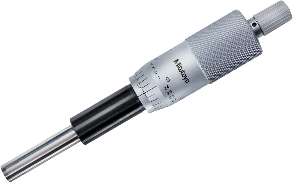 The Mitutoyo 151 series micrometer head has a wide 8mm-diameter spindle for heavy-duty use and a vernier scale in inch units for taking precise measurements. It is available with a plain stem for mounting in a fixture with a split-body clamp or setscrew, or a clamp-nut stem for quick mounting. The vernier scale is graduated to 0.001” or 0.0001” depending on the model, and has a satin chrome rust- and glare-resistant finish. The flat measuring face is carbide-tipped for wear resistance and is lapped to help provide accuracy.