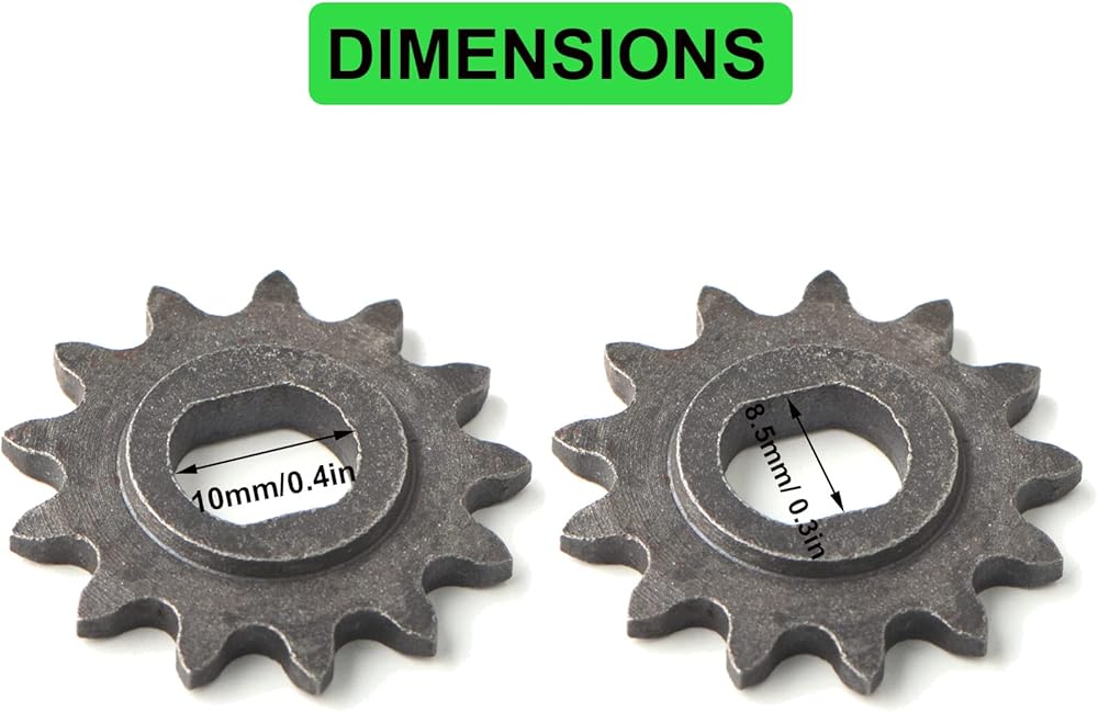 • 【Package Included】: 2 x motor sprocket. Tooth Thickness: 4mm / 0.16in; Inner Diameter: 10mm / 0.4in; Inner Diameter Width: 8.5mm / 0.3in. Size: 25H 13T.
