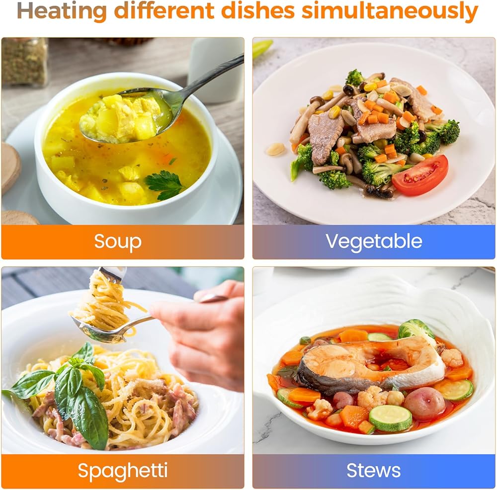 درجة حرارة قابلة للتعديل: يمكن تعديل درجة حرارة سخان الطعام هذا بسهولة من 86-185 درجة فهرنهايت/30-85 درجة مئوية، مما يجعل من السهل تسخين طعامك بسرعة والحفاظ على الأطباق الساخنة في درجة الحرارة المثالية.