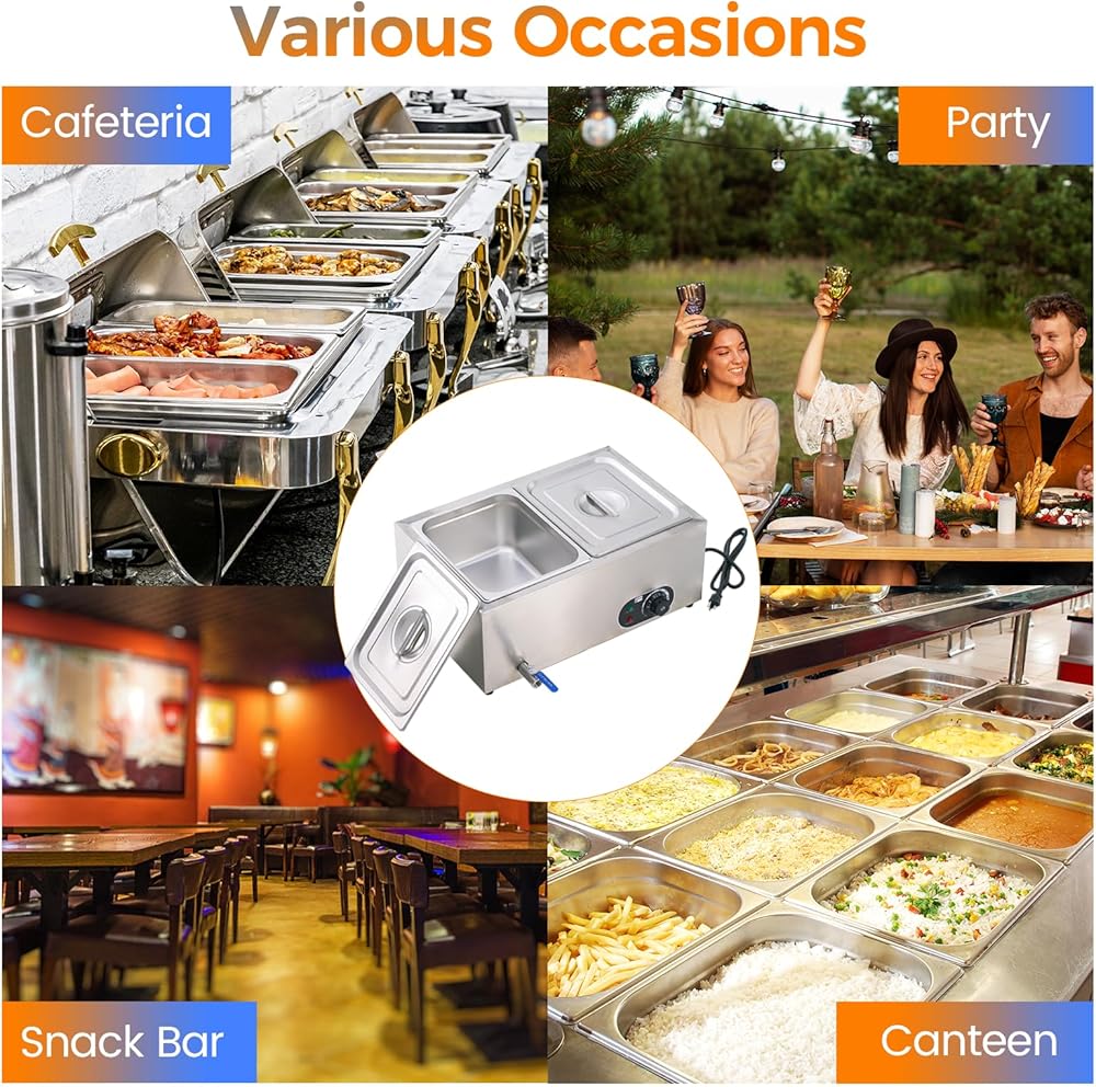 تطبيق واسع: مع خرج طاقة عالي يبلغ 1200 وات، يعد سخان الطعام مثاليًا للاستخدام في المطاعم والمطاعم والحفلات والكافيتريات والعطلات وغيرها من الأماكن أو المناسبات.