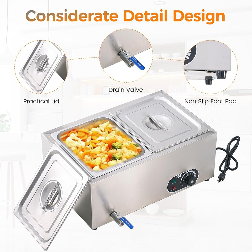 تصميم إنساني: تم تجهيز سخان الطعام بصنبور سهل الاستخدام يجعل من السهل التشغيل. ما عليك سوى حقن الماء وتسخينه للحفاظ على طعامك دافئًا ولذيذًا لفترة طويلة. المقالي القابلة للإزالة تجعل من السهل تنظيفها.