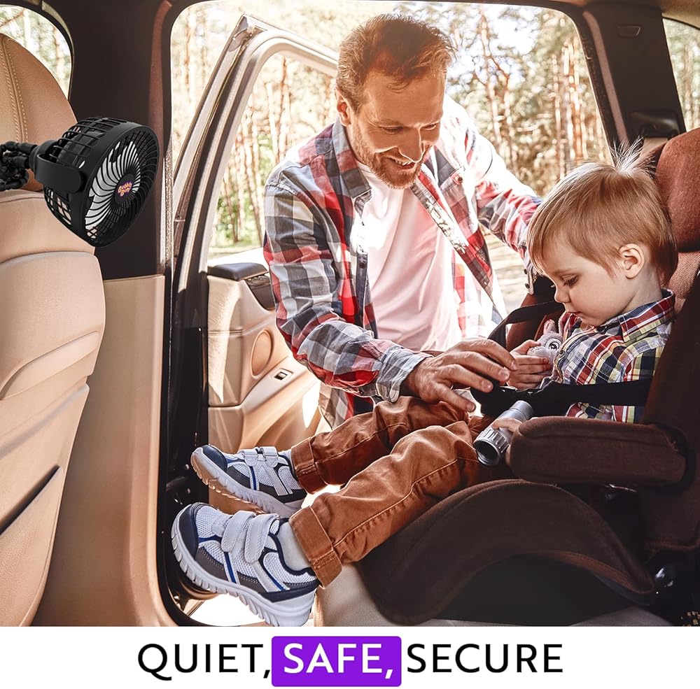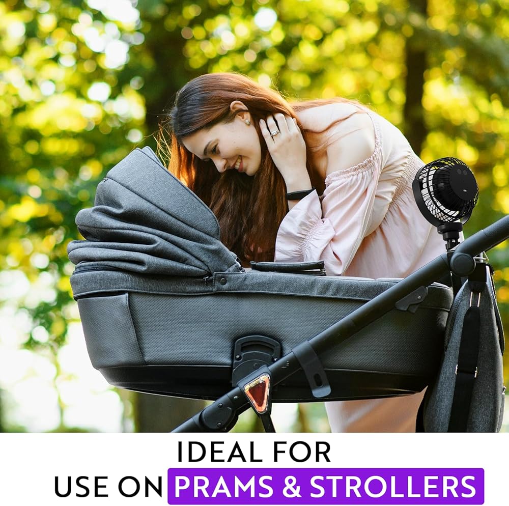 عمر بطارية طويل - تدوم البطارية المشحونة بالكامل لمدة تتراوح من 8 إلى 16 ساعة (اعتمادًا على سرعة المروحة وإعدادات الإضاءة). تحتوي على بطارية مدمجة بقوة 2600 أمبير وتتضمن كابل شحن USB. هذا التصميم المحمول للمراوح الصغيرة يجعلها أكثر ملحقات عربة الأطفال فائدة