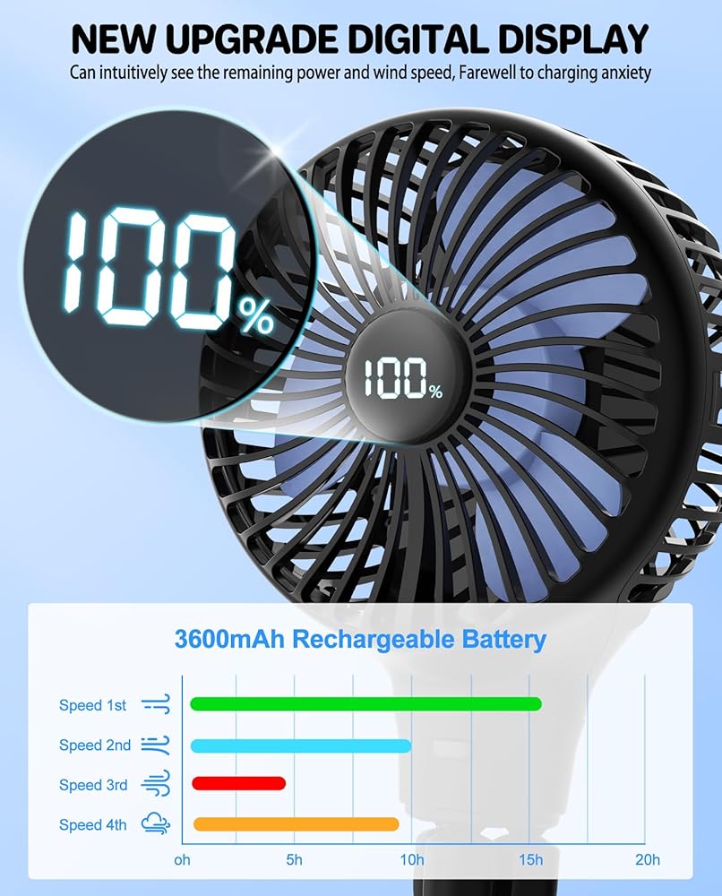 • 【شاشة طاقة LED】- مراقبة مستوى البطارية باستخدام شاشة LED وسرعات الرياح، تتيح لك التحكم في الطاقة المتبقية في أي وقت، من الآن فصاعدًا، تجنب الوضع المحرج لنفاد طاقة المروحة عند الخروج للمتعة.