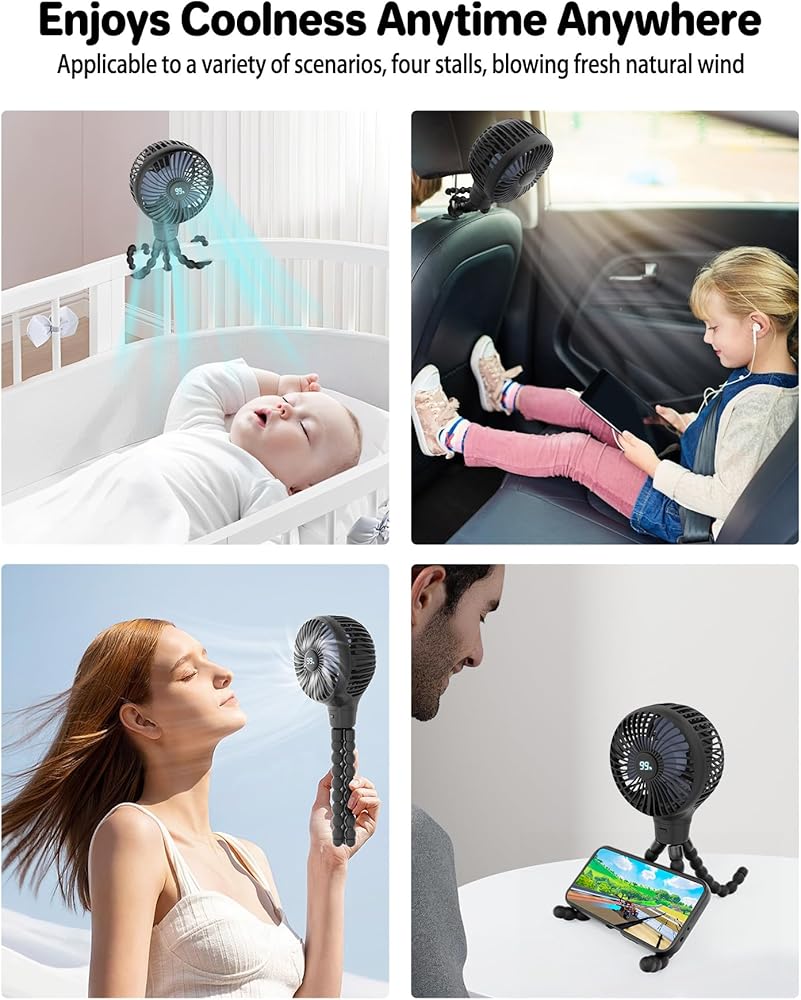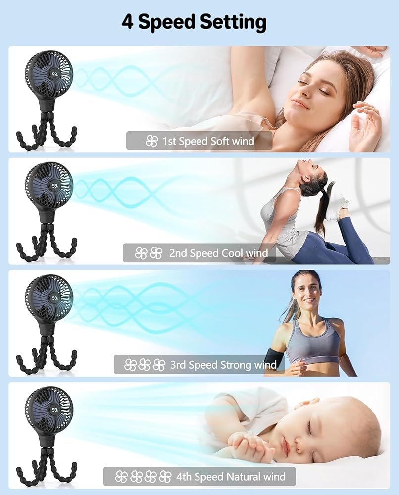 مروحة عربة أطفال محمولة، تذبذب واسع النطاق، شاشة عرض طاقة LED، 4 سرعات، مشبك ثلاثي مرن على المروحة، مروحة تبريد محمولة للمكتب بقدرة 3600 مللي أمبير في الساعة لمقعد السيارة وسرير الدراجة (4 بوصات أسود)
