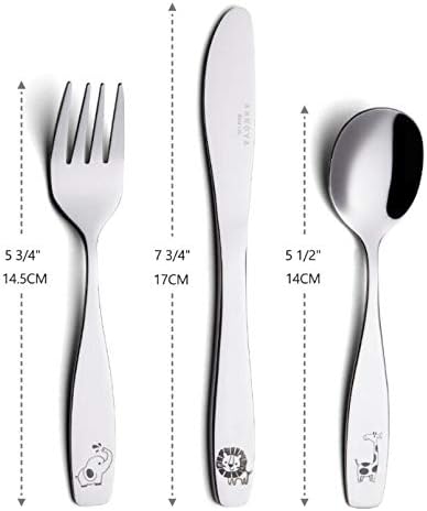 • يشتمل على: 3 × شوكة للأطفال (5.7 بوصة / 14.5 سم)، 3 × ملعقة عشاء للأطفال (5.5 بوصة / 14 سم)؛ سيكون الأطفال متحمسين لاقتناء أدوات فضية مثل البالغين ولكن بحجمها وآمنها. مصممة خصيصًا لمقاس الأطفال وسلامتهم.