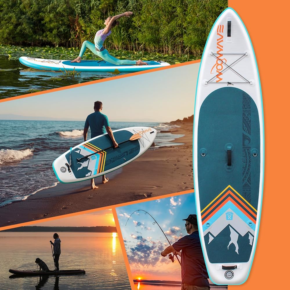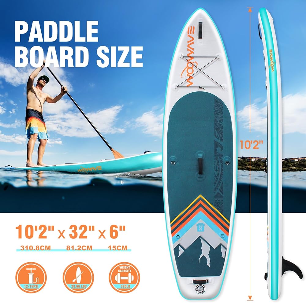 • 🏄𝗠𝘂𝗹𝘁𝗶𝗽𝘂𝗿𝗽𝗼𝘀𝗲 𝗨𝘀𝗲: WOOWAVE standup paddle board size is 10'2"X32"X6", suitable for all skill levels, ideal for adult beginners and professional athletes. Can be used in different waters, including oceans, lakes, rivers, etc., very suitable for water surfing, water yoga, sunbathing, fishing, etc