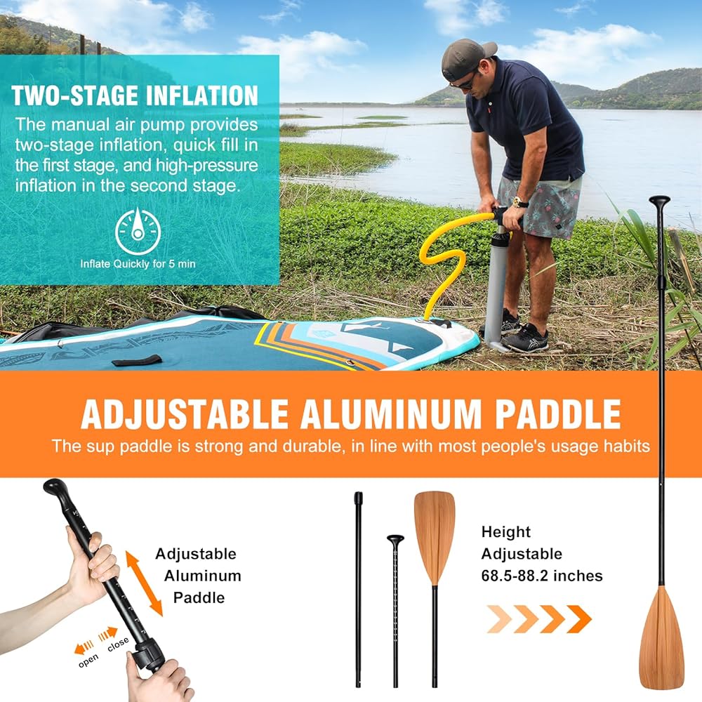 • 🏄𝗘𝗮𝘀𝘆 𝘁𝗼 𝗦𝘁𝗼𝗿𝗲 𝗮𝗻𝗱 𝗖𝗮𝗿𝗿𝘆: The portable stand-up paddle board adopts a rubber high-seal air valve, which effectively reduces air leakage. The hand pump with a high-pressure valve can inflate and deflate quickly, the convenient side handle can carry the paddleboard easily, and you can roll the deflated paddle into the backpack for easy moving or storage