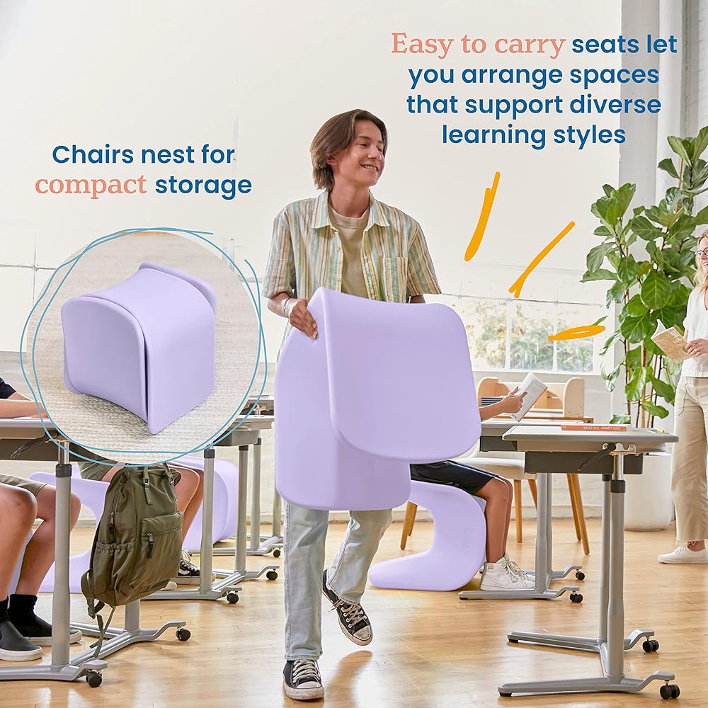The Wave Seat is a fun multi-positional chair to saddle, perch or sit. This stool grows with you for use with children to adults. The active core engagement stool evolves from a saddle-style seat with wobble base, to a perch seat, and full seating surface. The forward seat angle keeps legs engaged for active seating that supports upright posture and alertness. These chairs are intentionally designed for shorter periods of sitting, perfect for high-traffic spaces like libraries, common areas, outdoor classrooms, and places for quick conversations. Designed for everyday use in schools, homes or offices, these lightweight stools let you quickly rearrange workspaces. Easily circle up for discussions or pair with activity tables and desks for individual and collaborative work. Creative classroom seating supports different learning styles and empowers both students and teachers. These flexible seats provide freedom to move making it the perfect grab-and-go stool for taking the classroom indoors and out. When learning time is over, two seats nest together for compact storage to save valuable floor space. The streamlined one-piece plastic design features rounded edges and no hard corners for safety, comes fully assembled and is maintenance-free.