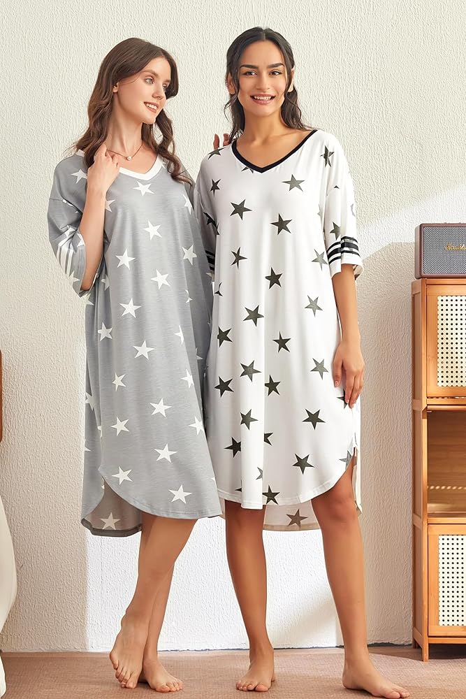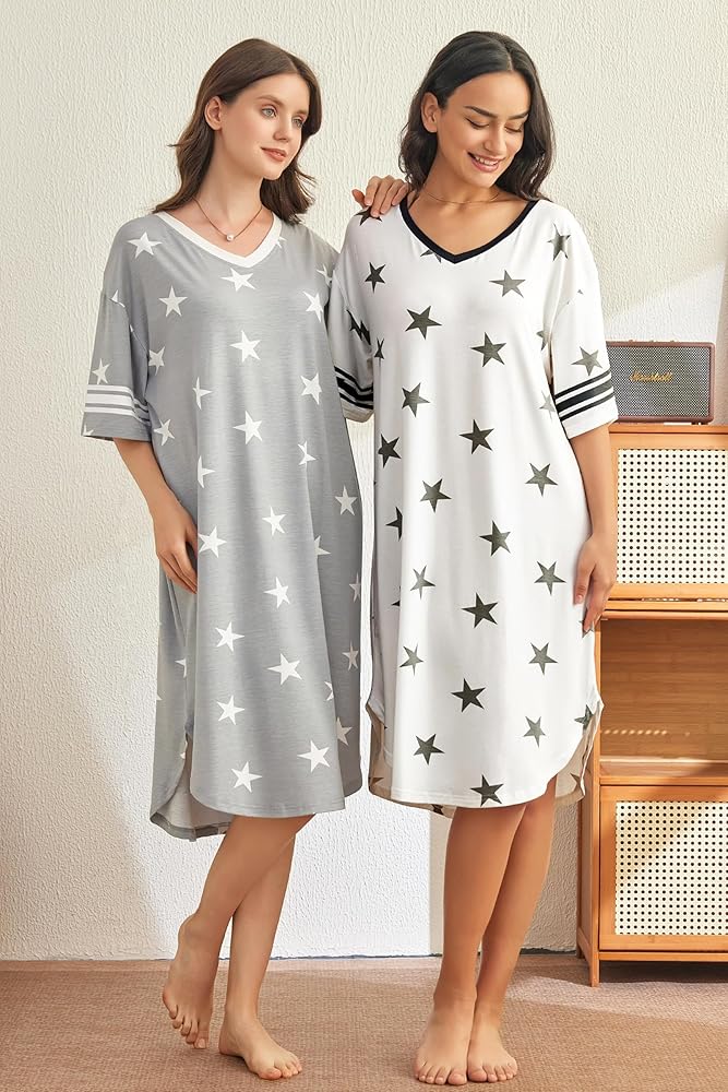 【تشمل العبوة】تحتوي كل عبوة على قطعتين من فساتين النوم. قمصان نوم نسائية قصيرة الأكمام مريحة وناعمة وصديقة للجلد، وفستان نوم مطبوع مريح. قمصان نوم فضفاضة مصنوعة من مادة 48% فيسكوز، 48% بوليستر، 4% ألياف لدنة.