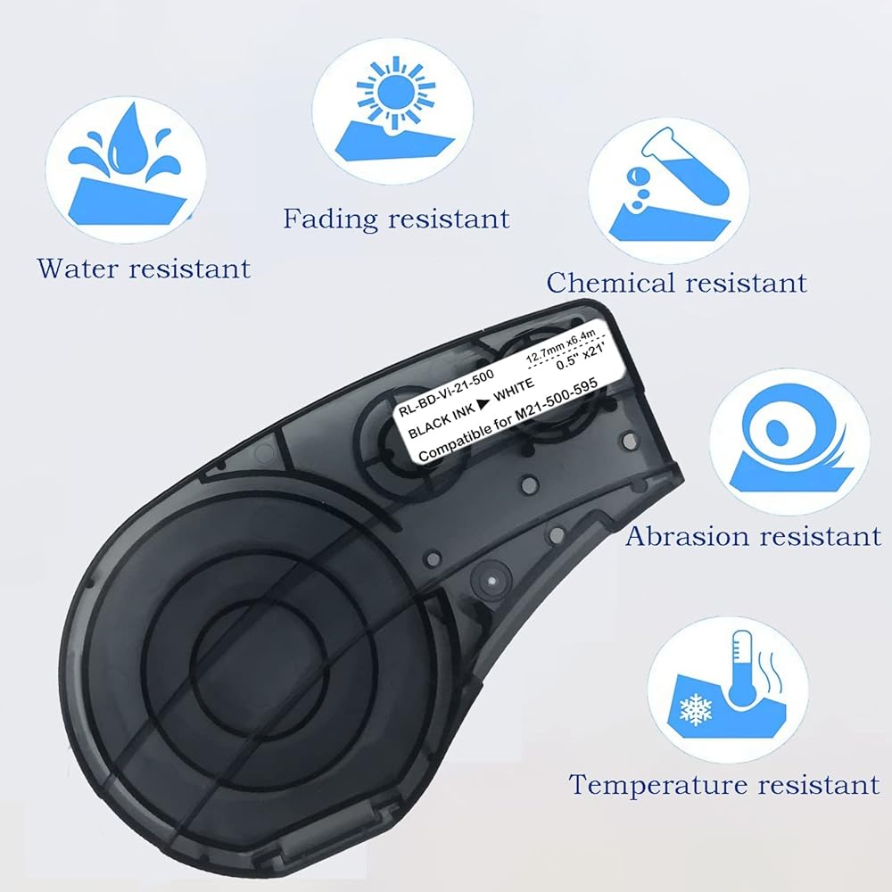 بديل شريط الملصقات المتوافق لشريط خرطوشة M21-500-595-WT، شريط ملصقات الفينيل عالي الالتصاق 1/2 بوصة، فيلم أسود على أبيض يعمل مع طابعة محمولة، طول 21 بوصة، عرض 0.5 بوصة - 4 لفات