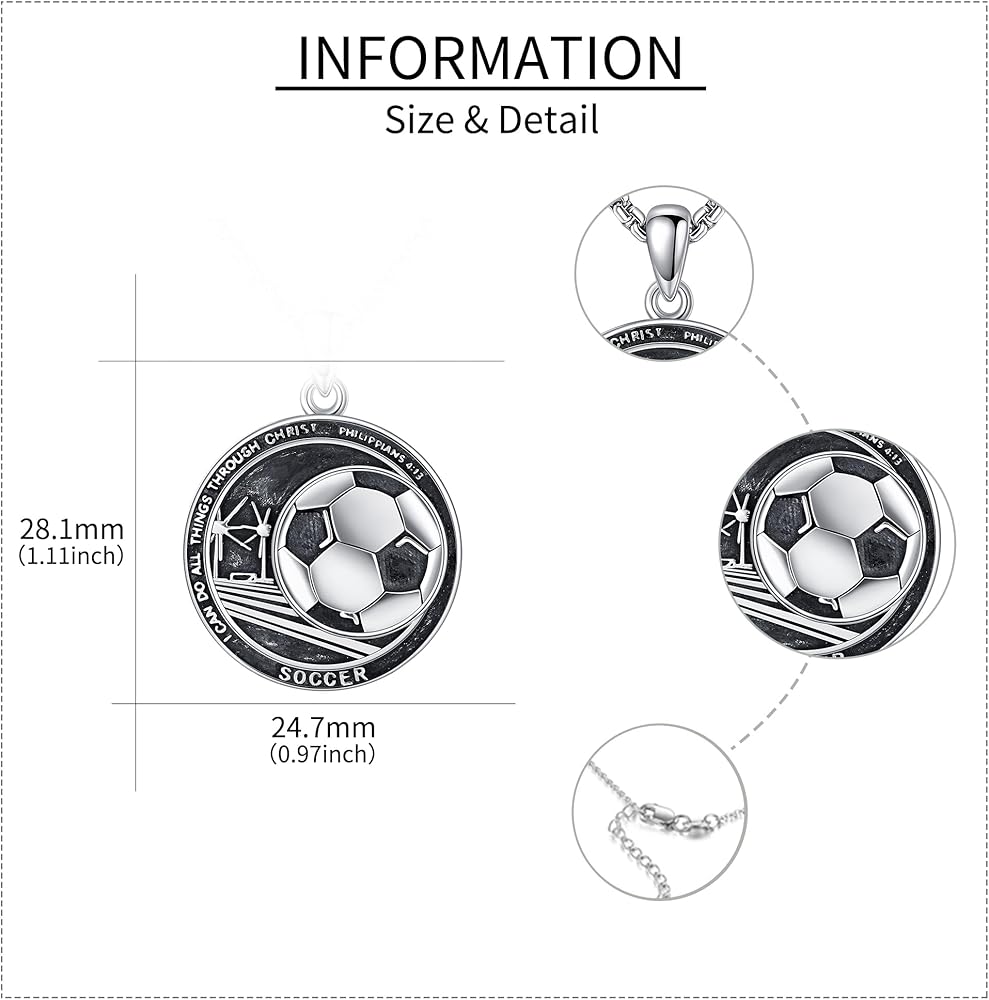 الحجم والحزمة: حجم القلادة: 28.1*24.7 ملم (1.11*0.97 بوصة) سلسلة من الفولاذ المقاوم للصدأ 22 بوصة+2 بوصة. قلادة كرة القدم هي قطعة لافتة للنظر ستجعلك مميزًا بين الآخرين. العبوة: 1 × قلادة كرة قدم من الفضة الإسترلينية، 1 × قطعة قماش تلميع، 1 × صندوق هدايا رائع.