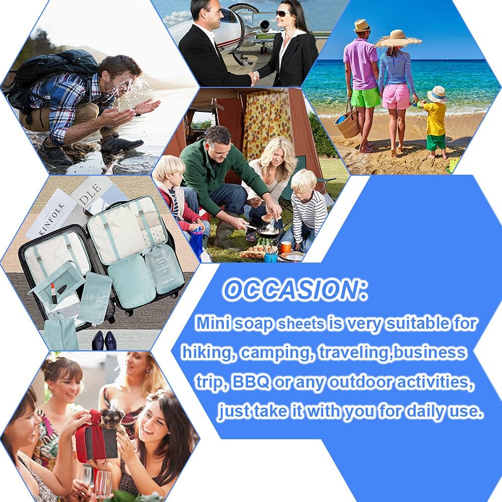 تم تصميم أوراق الصابون الورقية الصغيرة للسفر اليومي والمكتب والمدرسة والتخييم والمشي لمسافات طويلة والأنشطة الخارجية. حجم صندوق الصابون هو 3.1*2*0.39 بوصة، ويمكن وضعه بسهولة في الجيوب وحقائب اليد والمحافظ.