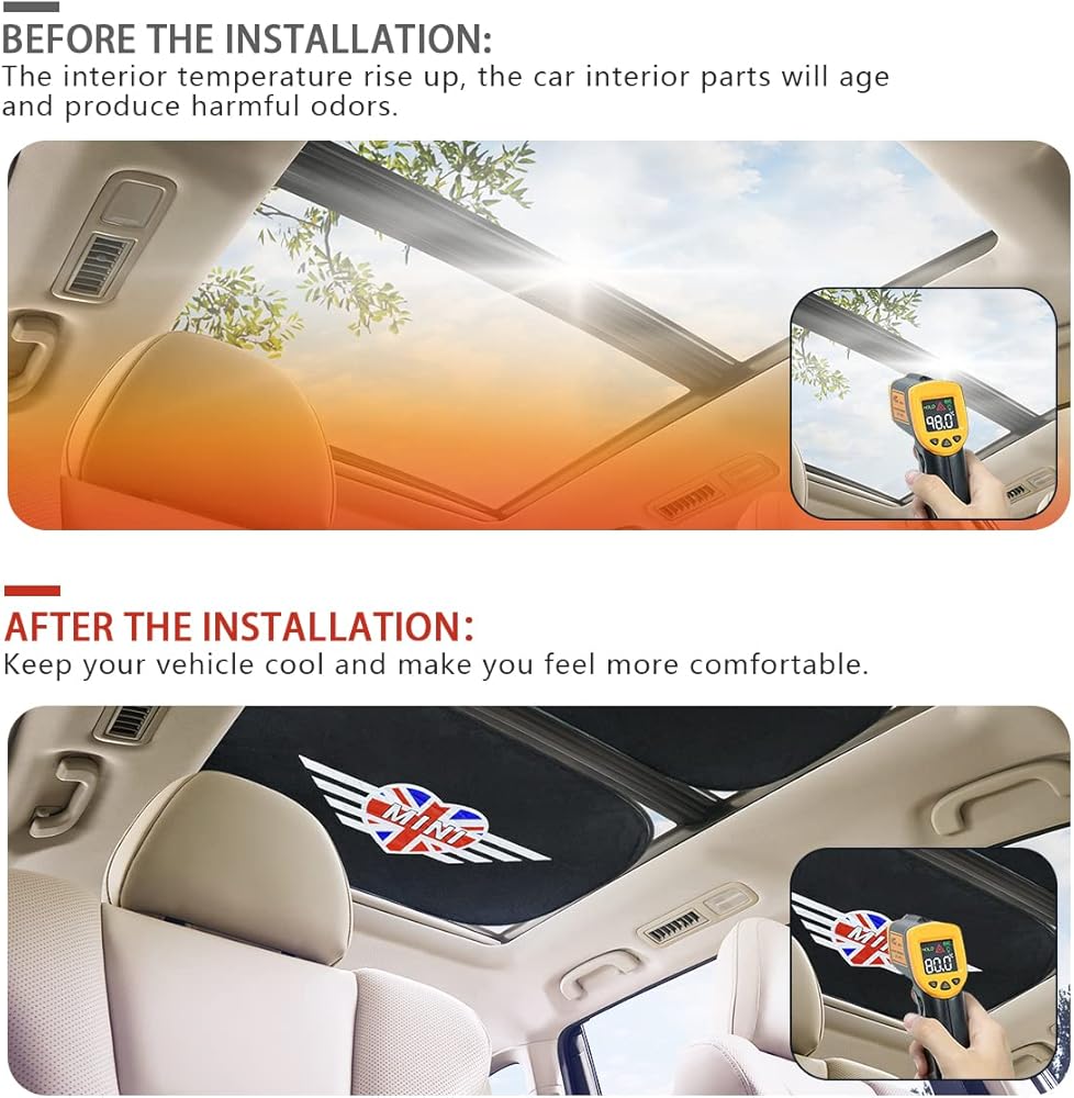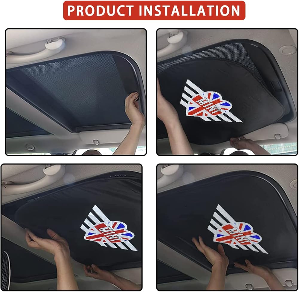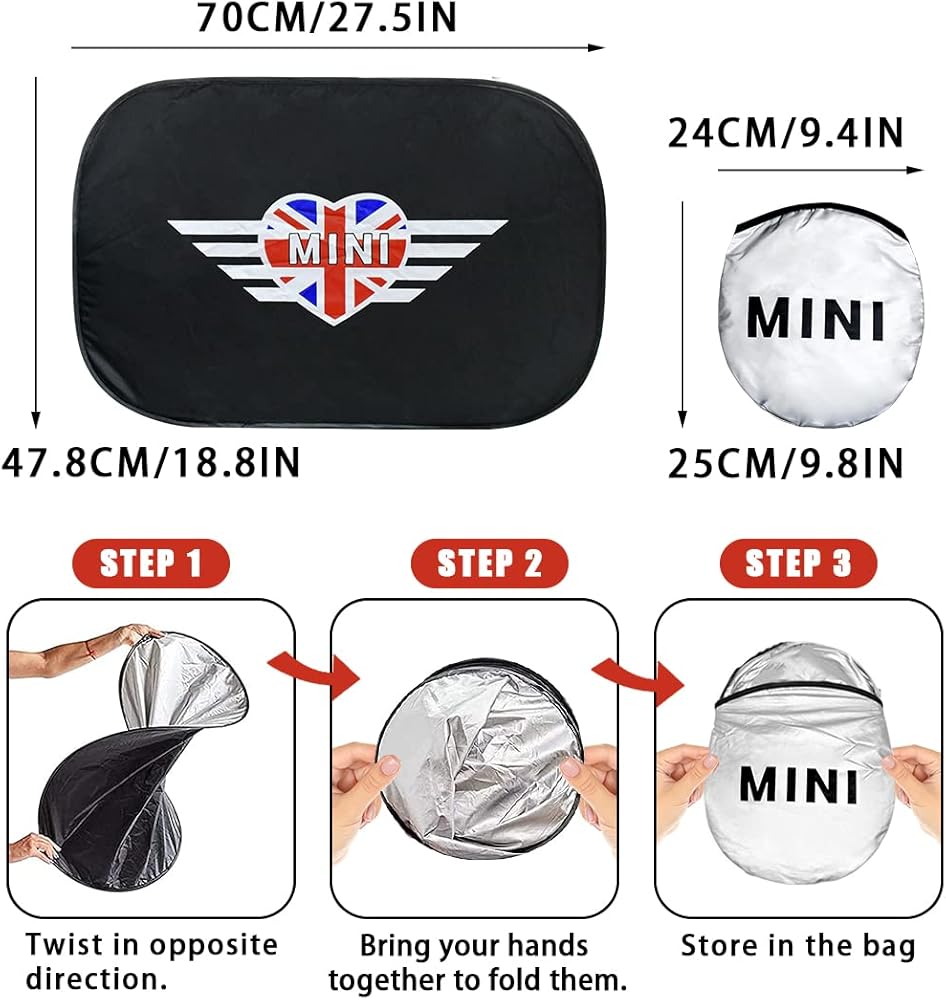 PRODUCT SIZE: 150cm x 70 cm/ 59 inch x 27.5 inch, circle diameter is 25.6 inch (65cm). COMPATIBLE WITH: all year models (2007-up) of MINI Cooper , MINI Clubman, MINI Countryman (including S models)F54 F55 F56 F60 R55 R56 R57 R58 R59 R60 R61. Package include: 1 x car windshield sunshade , 1 x pouch . -The sunshade equipped with pouch, you could fold the sunshade and store it in the pouch so tha t you could easily fit it in the trunk or between seats for quick and effortless access, it is so convenient and save space. The windshield sunshade fully covers the windshield, blocks all harmful rays, provides sun protection for the car interior. -The excessive sunlight including harmful rays definitely will ccause fading, cracking or discoloration of the seats, dashboard, and steering wheel! The windshield sunshade made by heat insulating coated reflective material, could reflect sunlight and isolate most sunlight heat and keep your vehicle interior cool, gives you a more comfortable driving experience. -Had you ever entering the car and feel unpleasant odor then had to hold your breath to open the car AC? After you had parked your car under the sun for a while, the car interior parts will start to produce harmful gas by the high-heat sun exposure. HOW TO USE 1.Open the windshield sunshade. 2.Place the sunshade against your windshield from the inside. 3.Put down the sun visor to prevent the sunshade from falling down. HOW TO FOLD 1.Fold the shade in half. 2.Twist in opposite direction and fold together. 3.Use the elastic straps to lock the sunshade. 4. Store the sunshade in pouch.