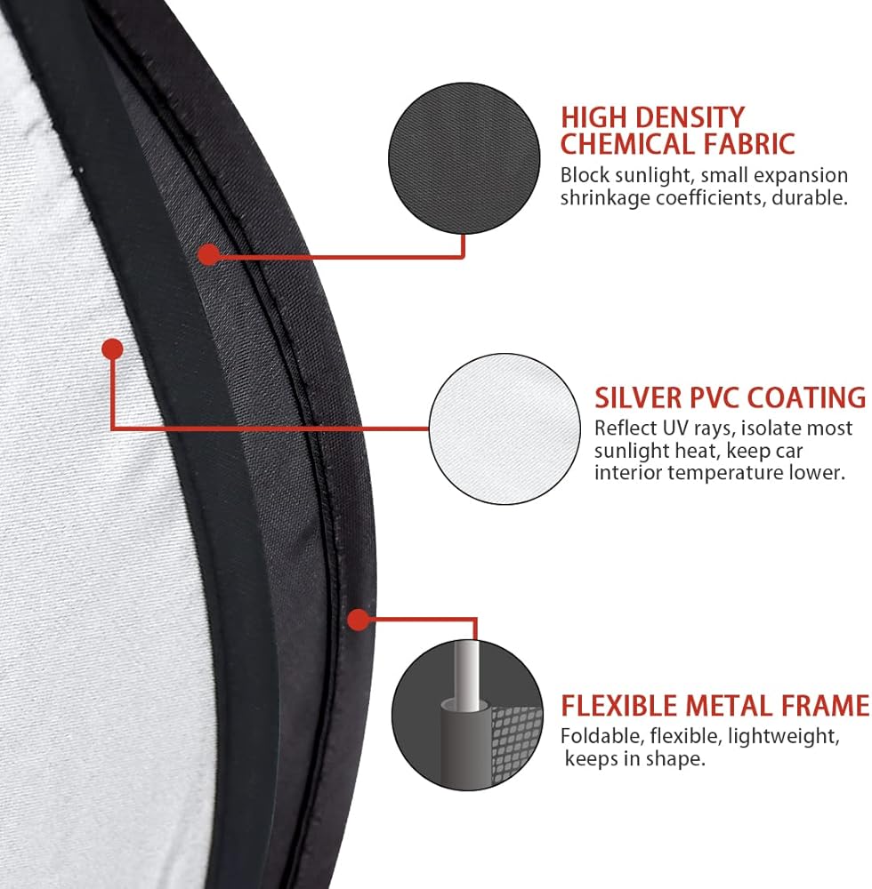 • The windshield sunshade made by heat insulating coated reflective material, could reflect sunlight and isolate most sunlight heat and keep your vehicle interior cool, gives you a more comfortable driving experience.