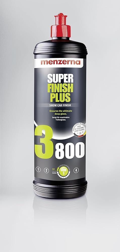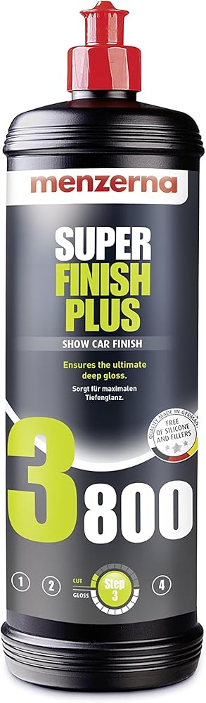 Menzerna Super Finish Plus 3800 is an ultra-fine finishing polish designed to leave paint with the highest levels of gloss possible. Manufacturers Menzerna developed this for the new breed of Scratch Resistant Coatings which are being introduced by many of the major paint manufacturers. It contains super fine uniform micro polishing grains to safely and effectively remove very fine 3000 grit marks from paint. It removes holograms and marring from more abrasive compounds as well as minor imperfections such as swirl marks and fine scratches. This is the ultimate polish to add the final touch before adding a layer of protection. The levels of gloss are incredible.
