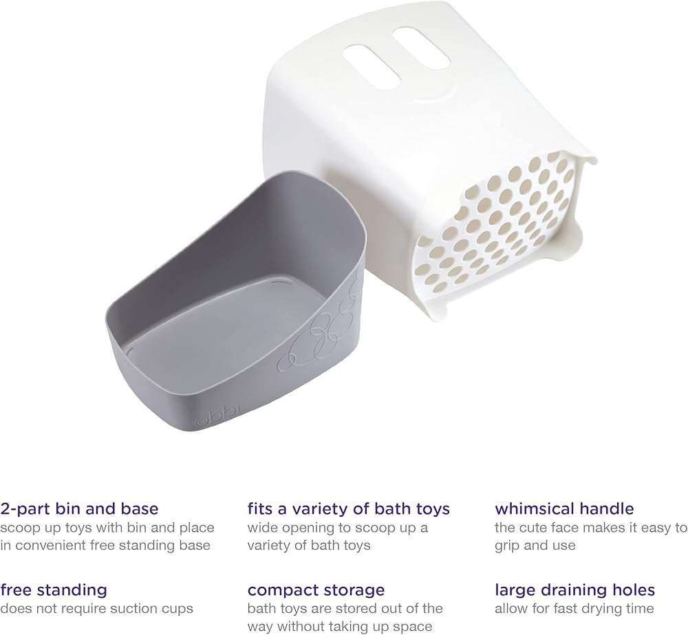 EASY TO USE: Scoop up bath toys with the handle after bath time, place bin in base, and leave until next bath time
