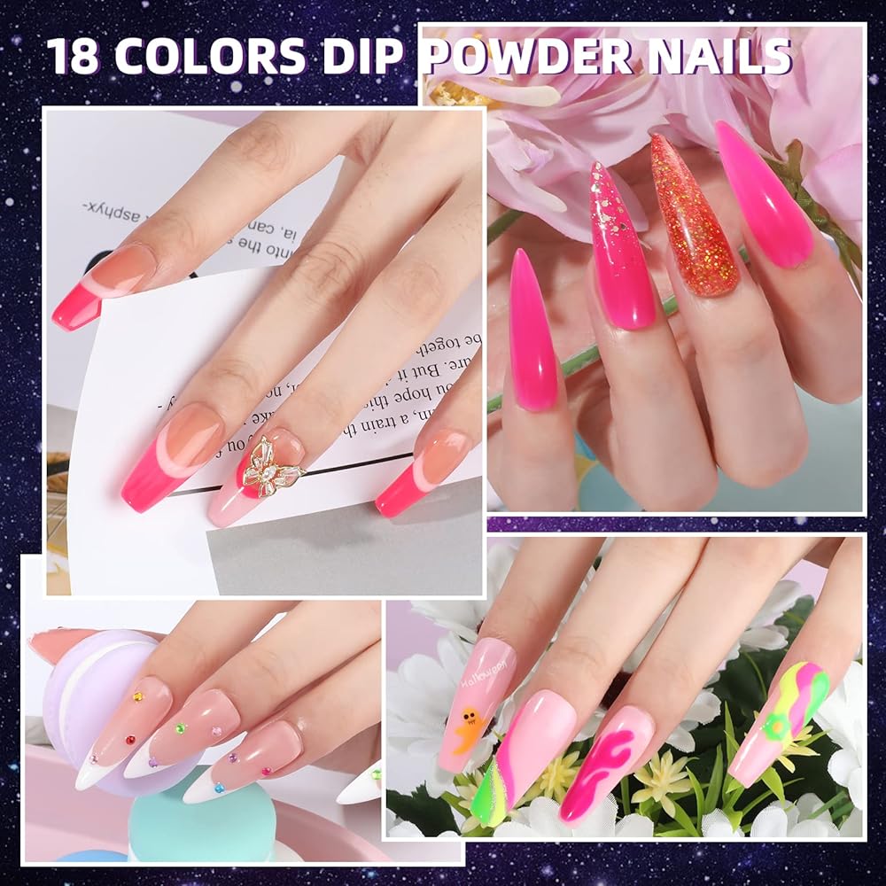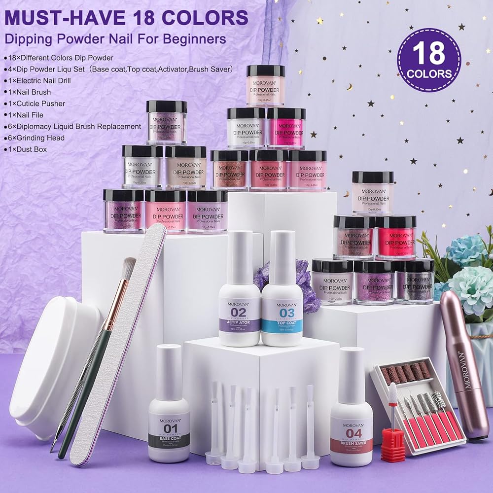 🎀مجموعة مسحوق غمس الأظافر المغربي 18: تتضمن مجموعة مسحوق غمس الأظافر 18 لونًا من مسحوق غمس الأظافر (10 جم/0.35 أونصة)، 4 قطع مجموعة سائلة أساسية 15 مل/0.5 أونصة (طبقة أساسية/طبقة علوية/منشط/حافظة للفرشاة) و الملحقات الأساسية الأخرى. بديل لفرشاة الجل البودرة من أجل توفير المال والوقت. مجموعة مسحوق غمس الأظافر مناسبة لجميع المواسم والحياة الروتينية اليومية. يمكنك بسهولة تحقيق فن الأظافر باستخدام مجموعة مسحوق غمس الأظافر.