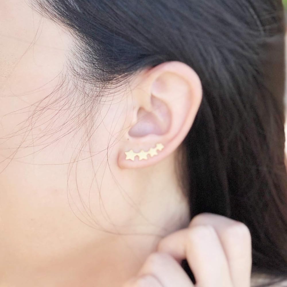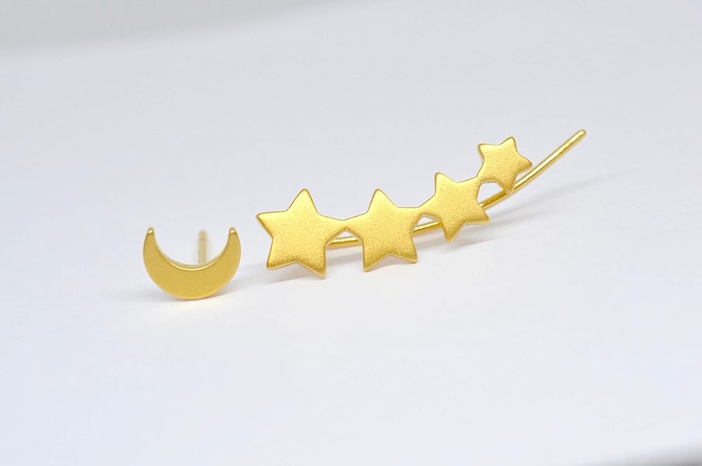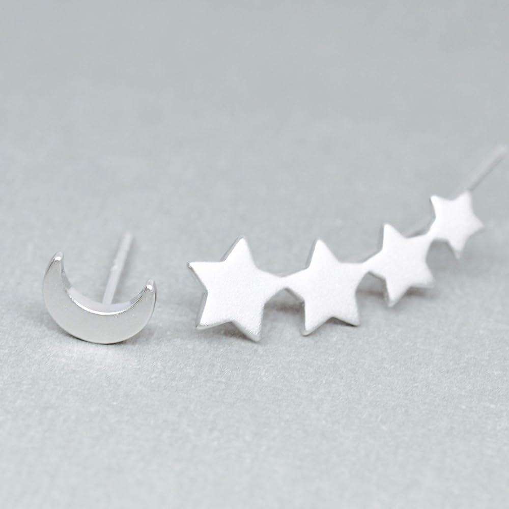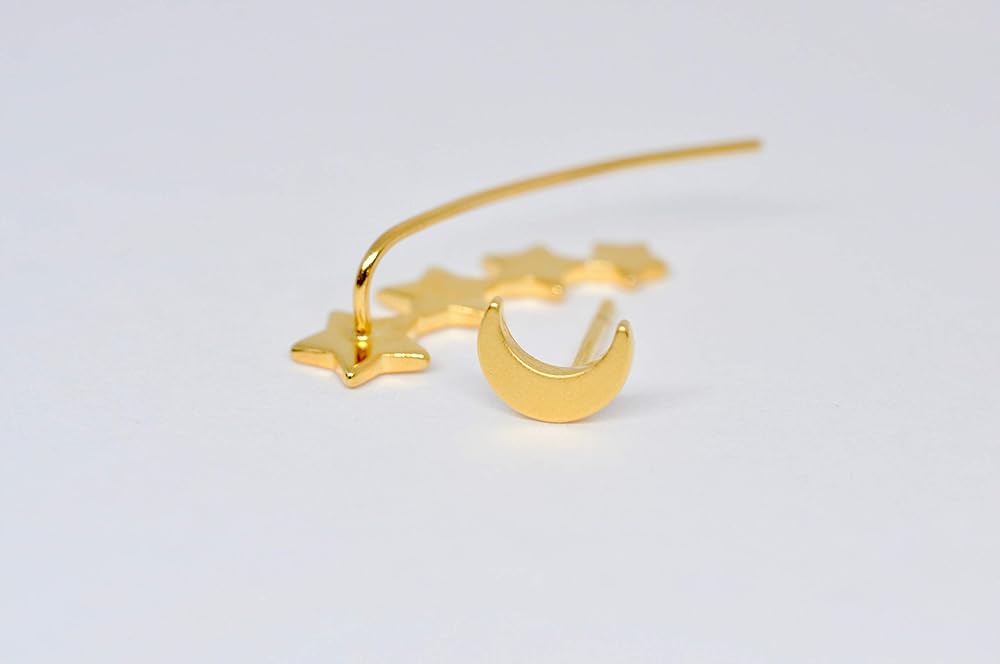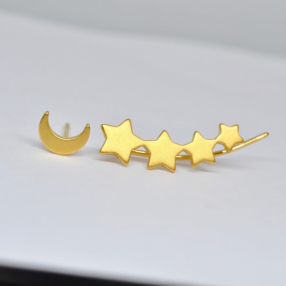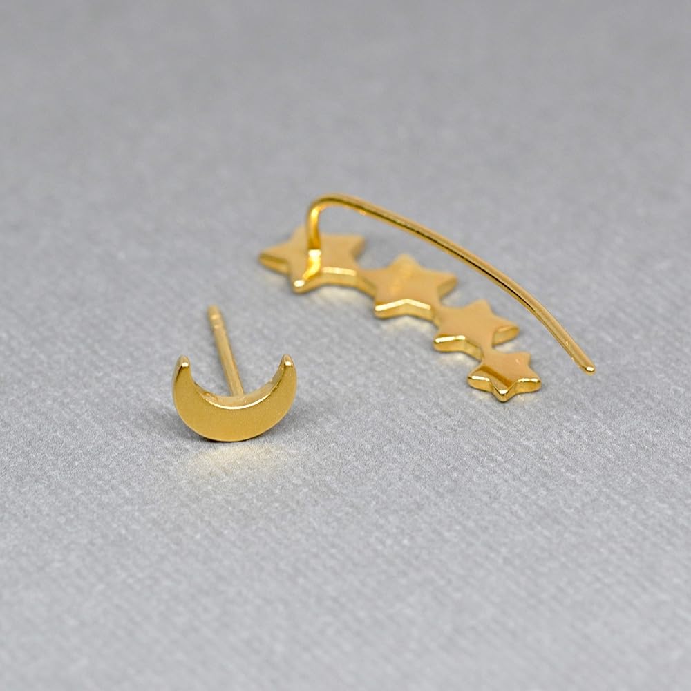 Crescent Moon Stud and Stars Ear Climber Mismatched Earrings