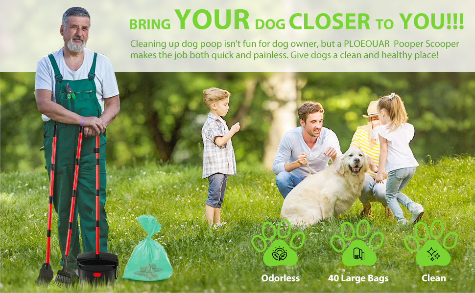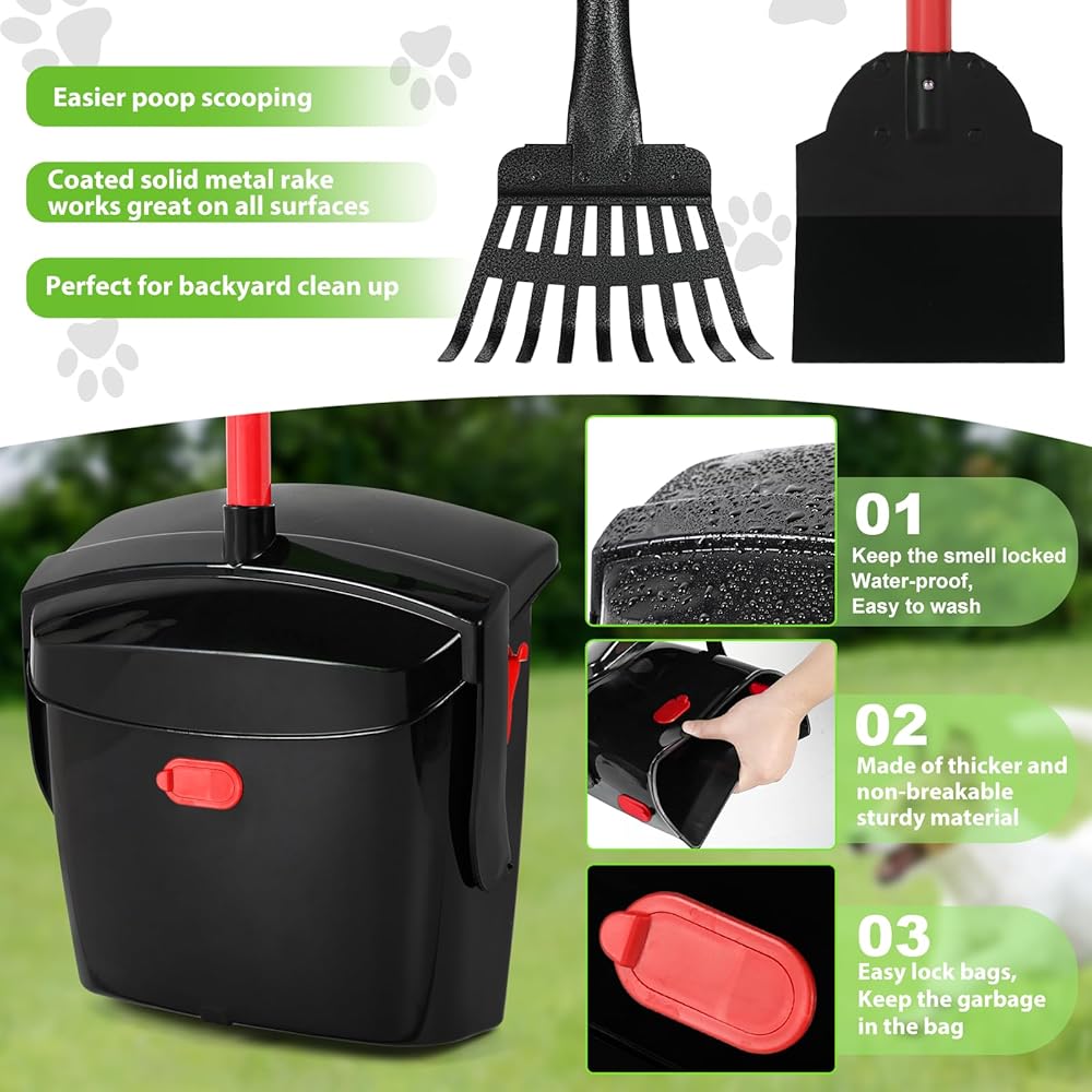 مغرفة مخلفات الكلاب من PLOEOUAR للكلاب الكبيرة شديدة التحمل، مغرفة مخلفات الكلاب للكلاب الصغيرة المتوسطة مع مقبض طويل لتنظيف نفايات الحيوانات الأليفة، سلة دوارة وأشعل النار ومجرفة مع 40 كيس نفايات للفناء في الهواء الطلق (أحمر)