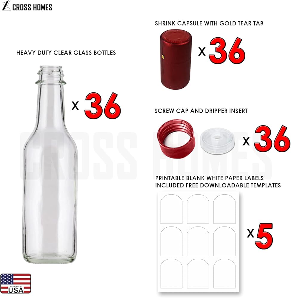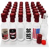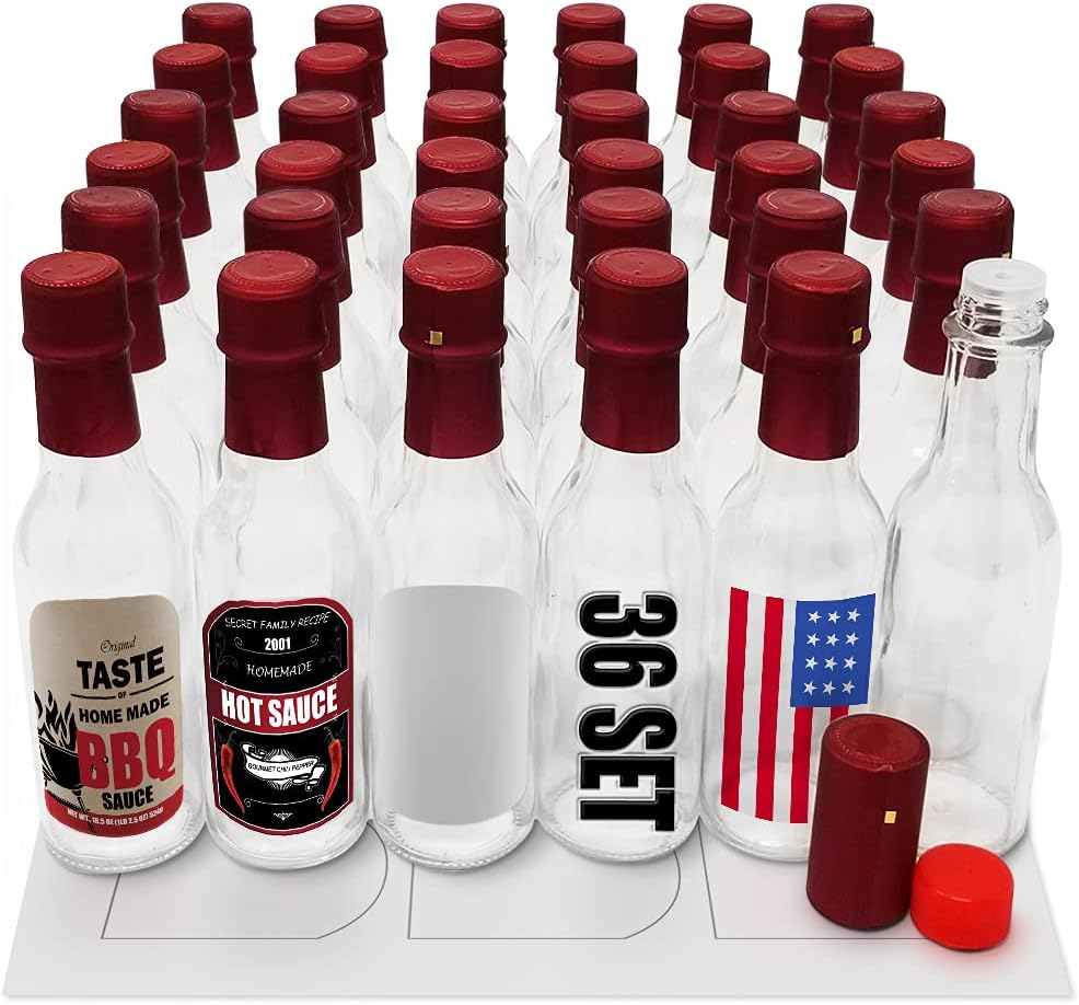 • مجموعات كاملة مكونة من 36 مجموعة صنع زجاجات الصلصة الحارة ووزي، وزجاجات مشروبات صغيرة، وزجاجات نبيذ صغيرة للاستخدام المنزلي، والبيع الاحترافي ومشاركة الهدايا: 36 مجموعة كاملة بما في ذلك زجاجة داشر زجاجية شفافة بوزن 5 أونصة مع كبسولة منكمش من مادة PVC عالية الجودة مع علامة تبويب ذهبية للدموع، وتسرب غطاء لولبي مقاوم، إدراج منقط مخفض الفتحة، 45 قطعة إضافية من ملصقات الزجاجات الفارغة القابلة للطباعة.