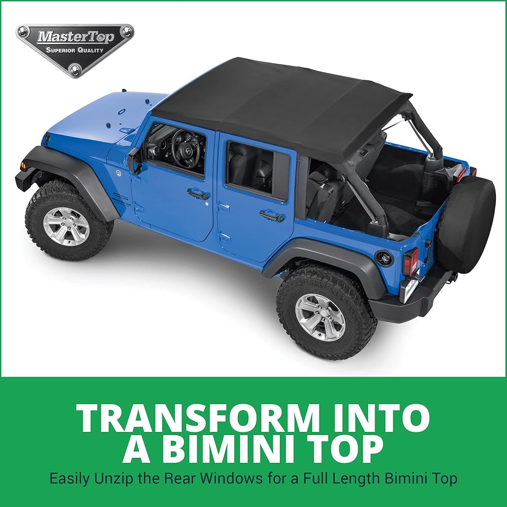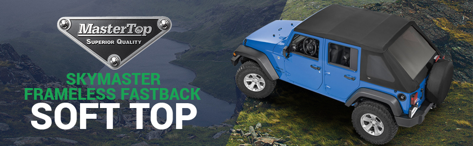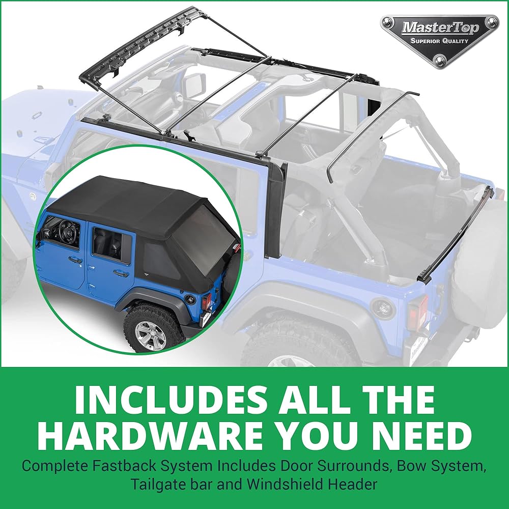 MasterTop SkyMaster بدون إطار Fastback Soft Top - يناسب Jeep Wrangler JK Unlimited 4 أبواب 2007-2018 - Jeep Wrangler Soft Top 4 أبواب - يتضمن أجهزة تجميع القوس - أسود MasterTwill