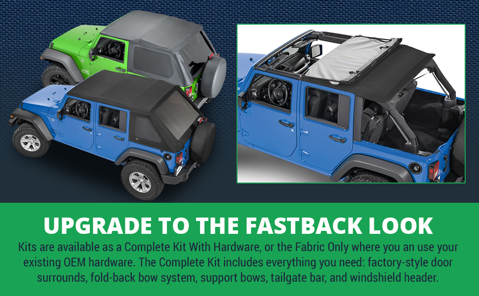 • مع أو بدون خيارات الأجهزة - متاحة للشراء مع الأجهزة، مجموعة علوية ناعمة كاملة بما في ذلك محيط الباب، ونظام القوس، وأقواس الدعم، وقضيب الباب الخلفي، ورأس الزجاج الأمامي. يستخدم خيار Fabric Only أجهزة المصنع الموجودة لديك