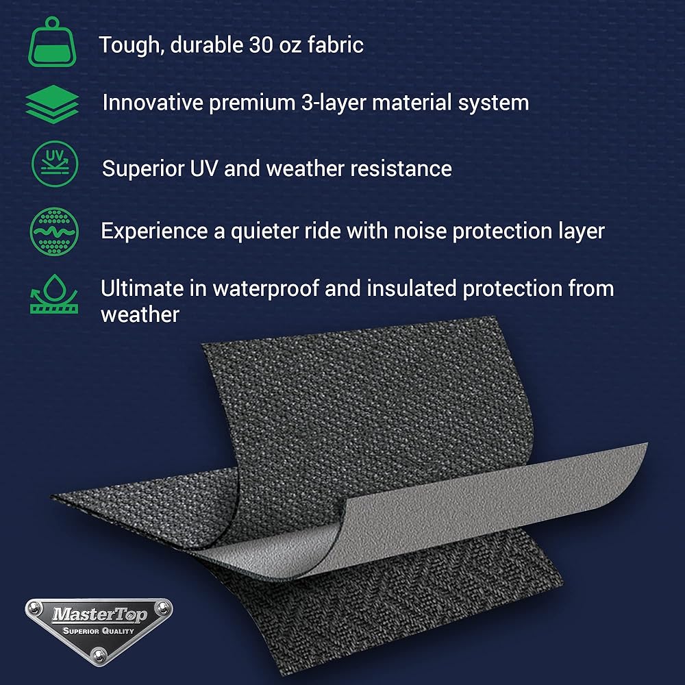• نوافذ فاخرة قابلة للإزالة - على عكس الزجاج "الملفوف" الذي يستخدمه المنافسون منخفضو التكلفة، يستخدم MasterTop زجاجًا مصقولًا لا يشوه رؤيتك ويضمن استخدامًا طويل الأمد. 40 مل، D.O.T. تتميز النوافذ الجانبية والخلفية المعتمدة بصبغة بنسبة 31%