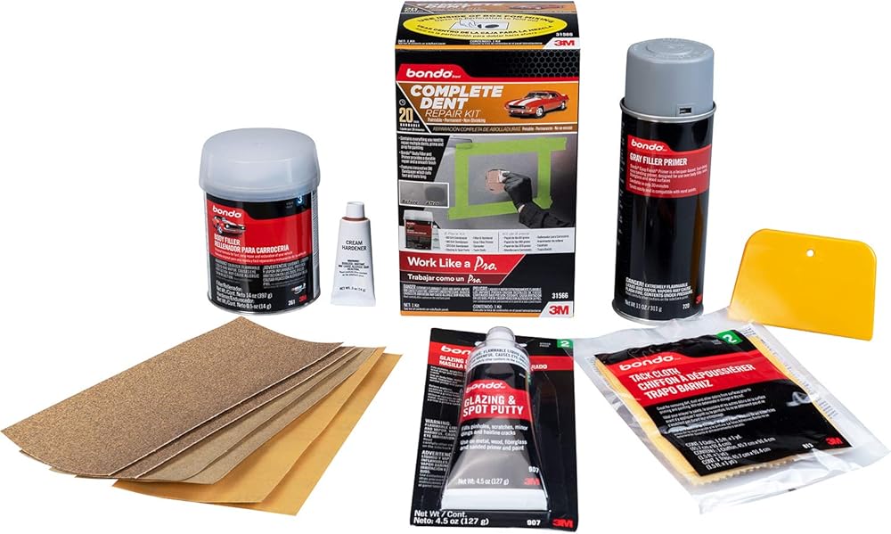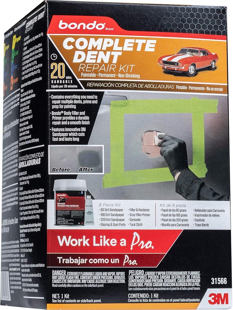 The Bondo Complete Dent Repair Kit provides everything you need for convenient dent repair. It features the well-known Bondo brand, trusted by auto body professionals. This kit is excellent for use as part of a complete body repair system from 3M.