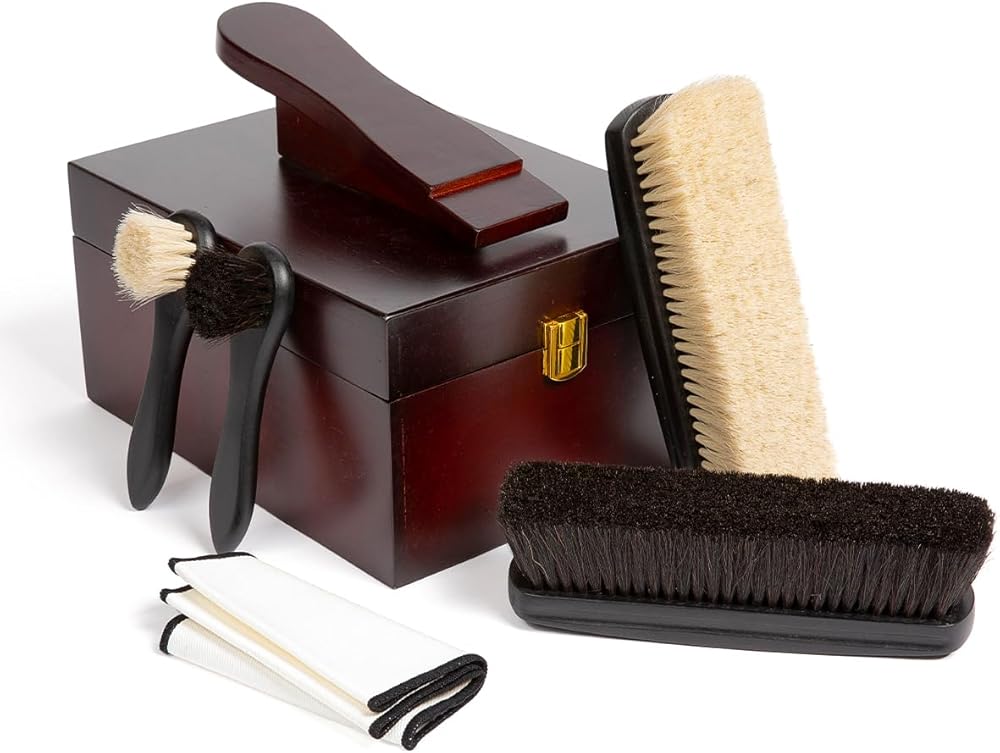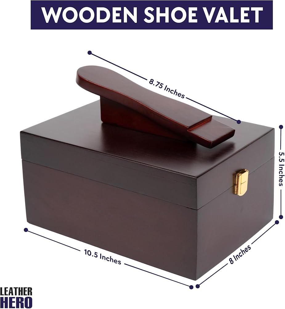 • مجموعة كاملة للعناية بالأحذية: تتضمن فرشتين احترافيتين للتلميع، وأداة لوضع المكياج، وقماش لامع فاخر، وصندوق خشبي للتخزين المنظم.