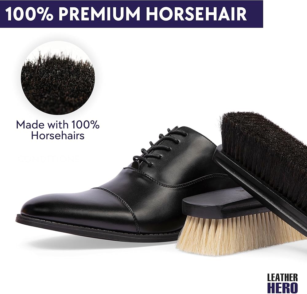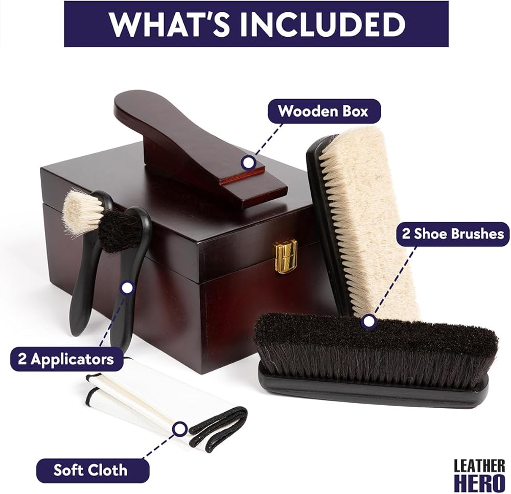 مجموعة تلميع الأحذية الجلدية من ليذر هيرو - مجموعة تلميع الأحذية الفاخرة للرجال مع صندوق خشبي لتلميع الأحذية، وفرشاة احترافية لشعر الخيل، وأدوات تطبيق، وقماش لامع - مجموعة كاملة لتلميع الأحذية
