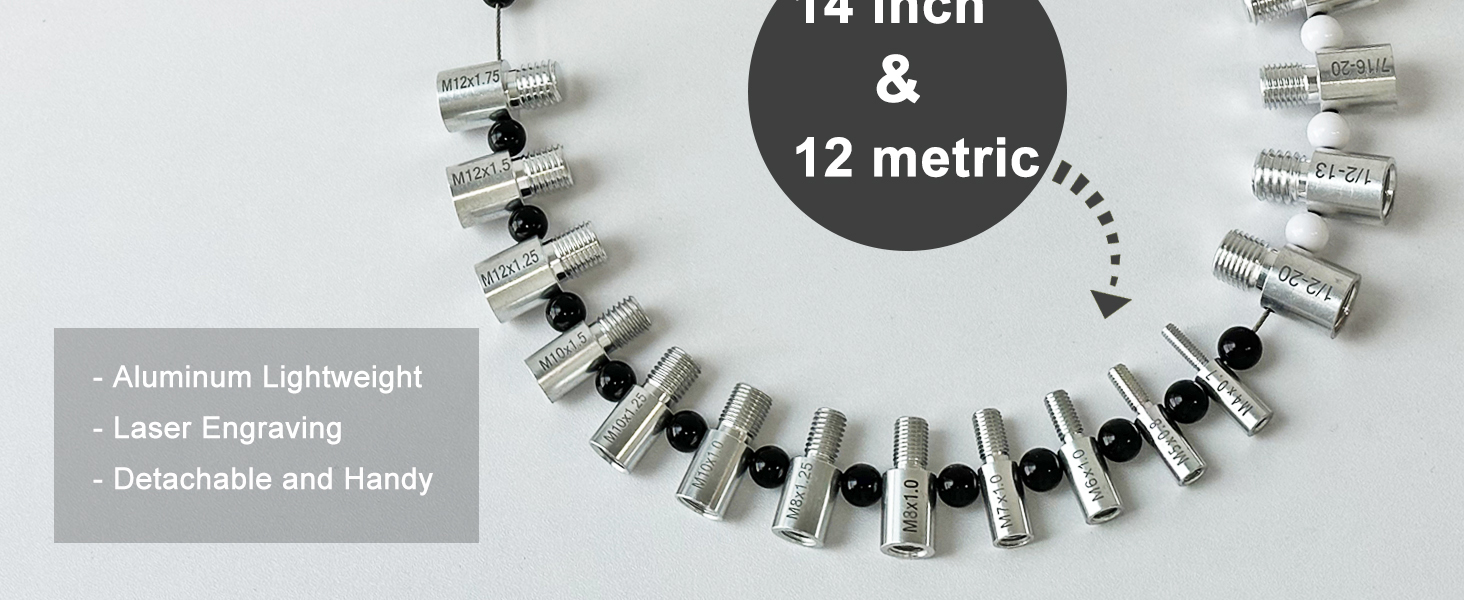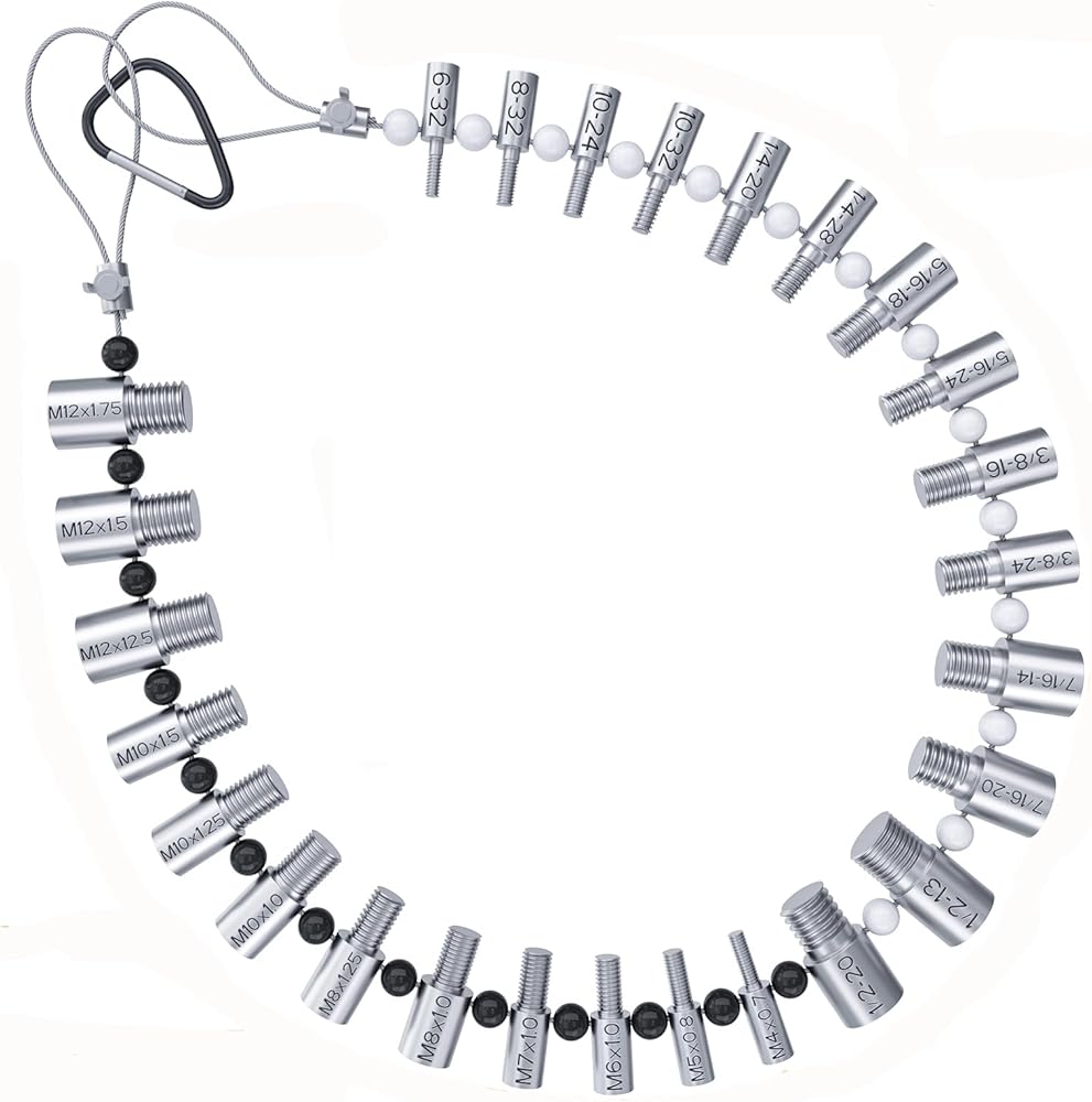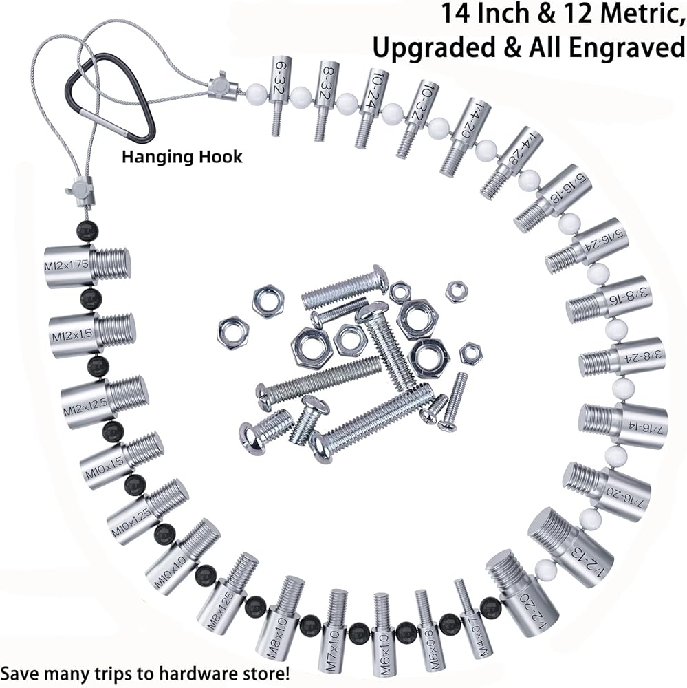 فحص الخيط المحفور: فحص خيط الصواميل والمسمار المطور منقوش بـ 26 مسمارًا وصواميل ذكر/أنثى مقاس 14 بوصة و12 متريًا، حروف دائمة وسهلة القراءة. يتميز حجم الترباس الفردي ومقياس الخيط بوجود مسمار ملولب ذكر في أحد الأطراف وفتحة ملولبة أنثوية على الطرف الآخر. تتميز أحجام البوصات والمتري لمعرف خيط الترباس بالخرز، وحجم البوصة بالخرز الأبيض والحجم المتري بالخرز الأسود.
