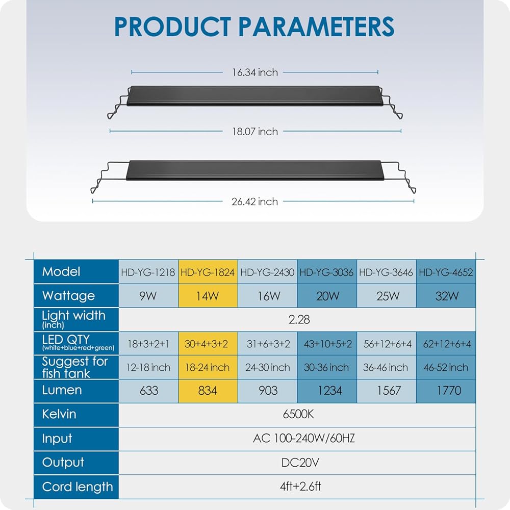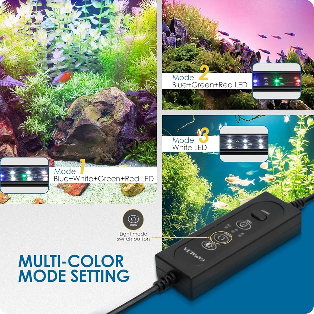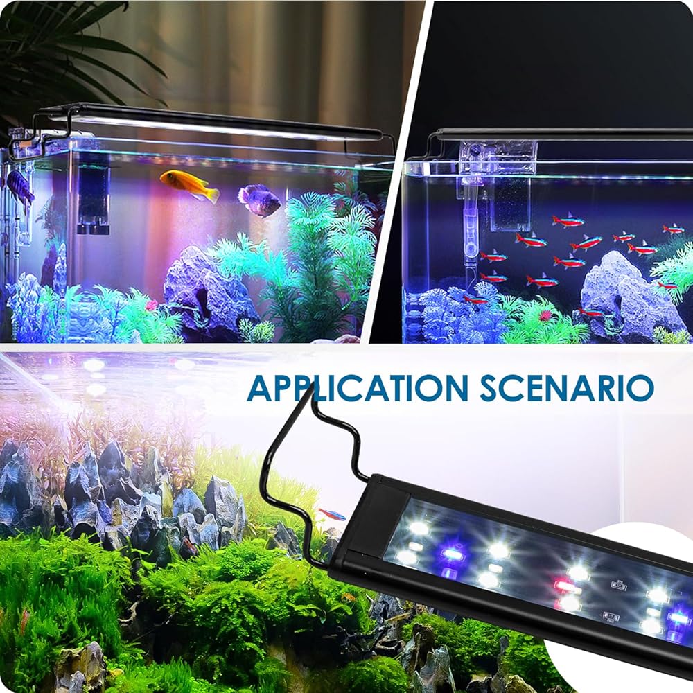 【3 أوضاع إضاءة وأقواس قابلة للتعديل】 يتميز مصباح حوض السمك هذا بـ 3 أوضاع إضاءة: مصابيح LED بيضاء + زرقاء + خضراء + حمراء، مصابيح LED زرقاء + خضراء + حمراء، ومصابيح LED بيضاء. يمكنك تغيير اللون بسهولة عن طريق الضغط على زر "MODEL" الموجود على وحدة التحكم من 1 إلى 3 مرات، مما سيجعل حوض السمك الخاص بك يبدو وكأنه 3 مناظر رائعة مختلفة. يمتد الحامل القابل للسحب حتى 6 بوصات ويناسب معظم خزانات المياه العذبة بأغطية أو بدونها. . يوفر السكن المصنوع من الألومنيوم مع الأخاديد مقاومة ممتازة للماء وتبديد الحرارة.