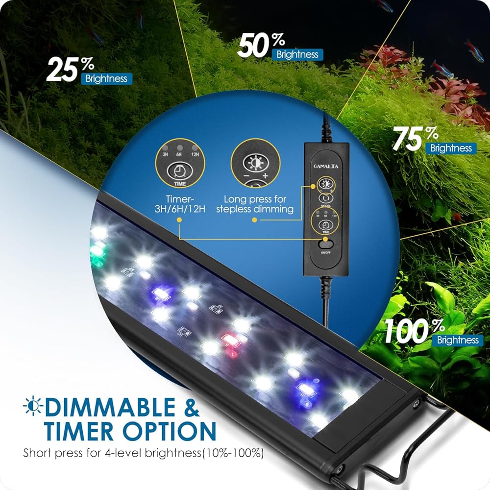 【إضاءة حوض السمك كاملة الطيف】هل تبحث عن ضوء LED فائق السطوع لحوض السمك الخاص بك؟ تحقق من مصباح LED لحوض السمك هذا من Gamalta! تعمل الإضاءة كاملة الطيف على تعزيز نمو الأسماك والنباتات المائية، وهي مناسبة لجميع خزانات المياه العذبة. وحدة التحكم بسيطة للغاية وسهلة الاستخدام. تيار مستمر 20 فولت/9 وات، الإدخال: تيار متردد 100-240 فولت/60 هرتز.