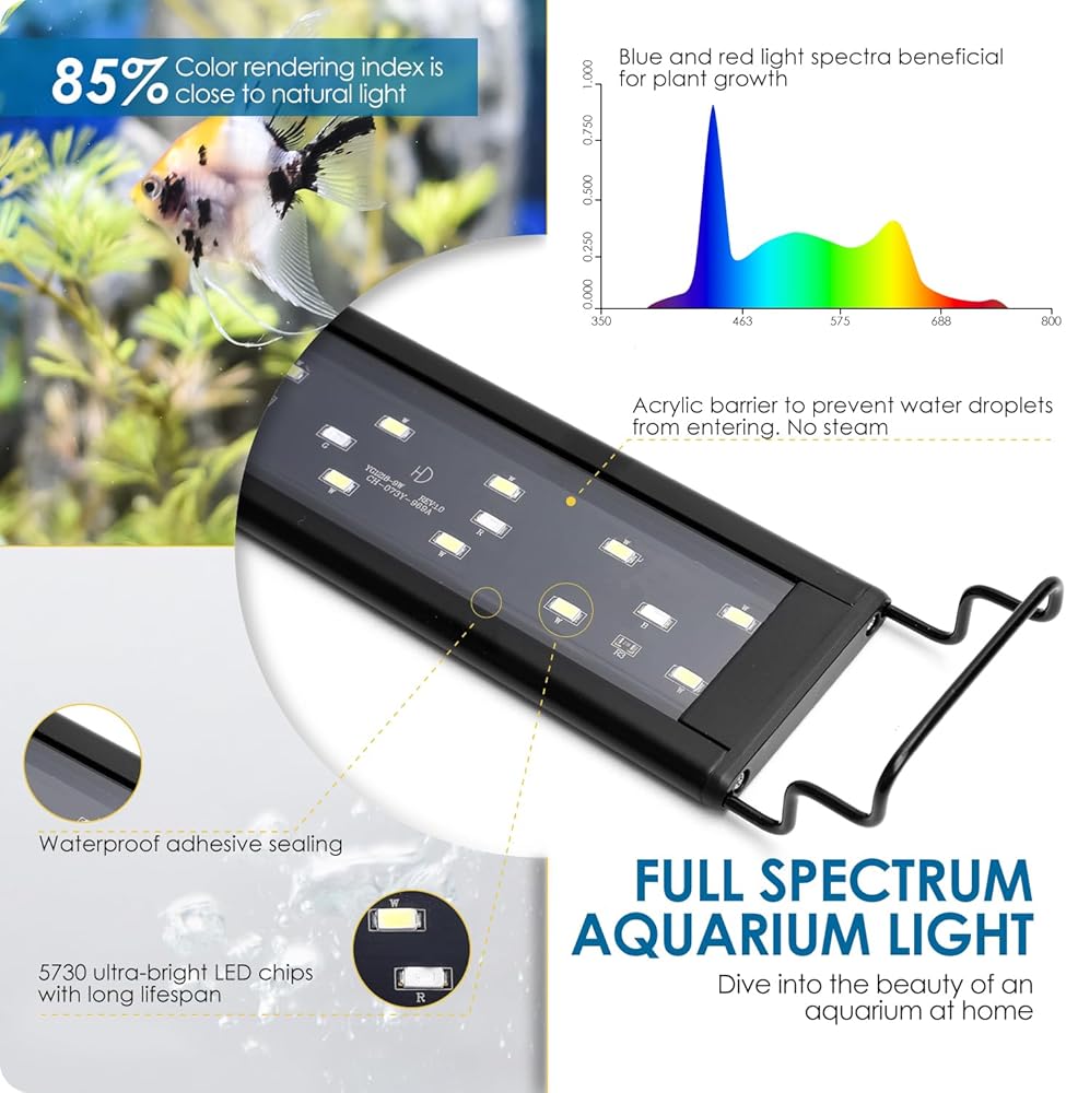【صديقة للعين】خرزات LED 5730+5050 عالية الجودة توفر إضاءة ثابتة دون وميض. يحاكي مؤشر ترجيع الألوان بنسبة 85% الضوء الطبيعي، مما يوفر تجربة إضاءة أفضل لعينيك وأسماكك. إن خرزات LED محمية بغراء مانع للتسرب وحاجز أكريليك للحصول على أداء فائق مقاوم للماء وعمر افتراضي أطول.