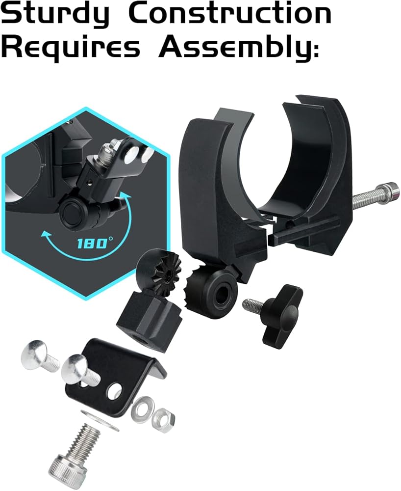 التثبيت - يشتمل على عازل اهتزاز مطاطي لمنع الحركة، ويحمي أيضًا اللمسة النهائية على القضيب الدوار الخاص بك. مع دعامة مشبك على شكل حرف C، يمكن الدوران بسهولة إلى الزاوية المرغوبة، الزاوية القابلة للتعديل من 180 درجة إلى 360 درجة.