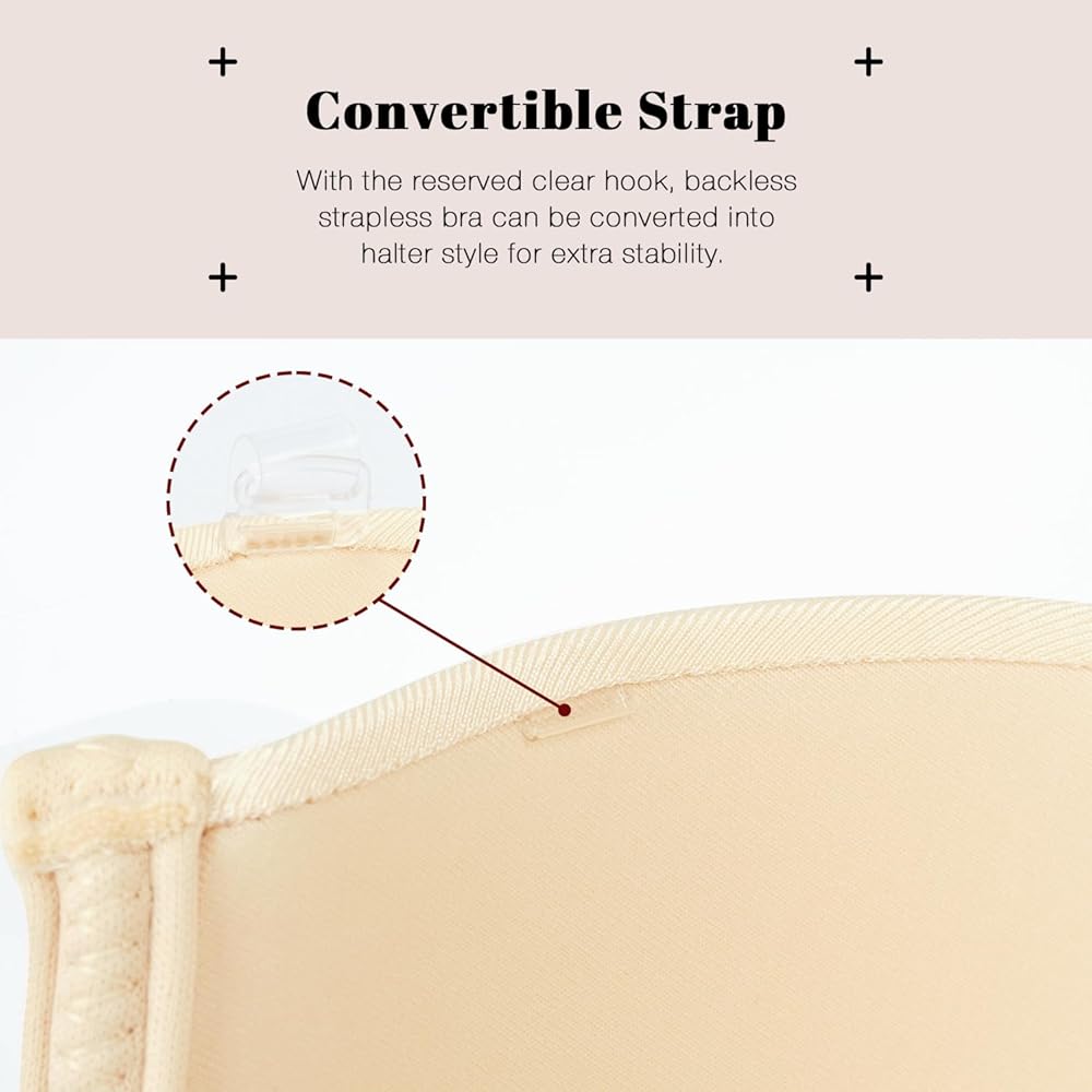 A free clear strap came with package as bonus. With the strap on, the backless strapless bra can be converted into Halter Style for extra support. Strapless or Halter is at your choice.