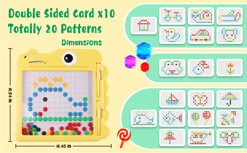 • 4. [20 نمطًا مختلفًا] - يأتي مع 10 بطاقات مزدوجة الجوانب مع 20 نمطًا وقلمين مغناطيسيين، ويتم تثبيت كلا القلمين في مكانهما بخيط، لا مزيد من القلق بشأن فقدانها بعد الاستخدام. أدخل البطاقات في فتحة لوحة الرسم، يمكن للأطفال أن يبدأوا بحرية في تشكيل أي أنماط يريدونها.