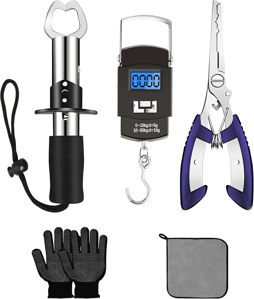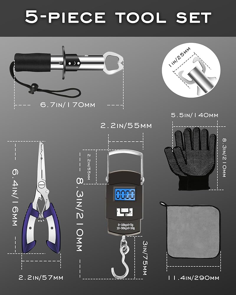 • مجموعة أدوات الصيد المثالية: تتضمن أدوات الصيد كماشة صيد متعددة الوظائف*1، مقياس صيد*1، مشبك شفاه السمك*1. كماشة الصيد يمكن أن تقطع خط الصيد بسهولة، وفك الخطاف، ومنحنى اللف، واستبدال الطُعم والخطافات. يتميز مشبك شفة السمكة بقدرة وزن جيدة، وسهل التحكم في الأسماك الكبيرة. تلبي جميع احتياجات الصيد، أفضل هدية لأصدقائك وعائلتك.